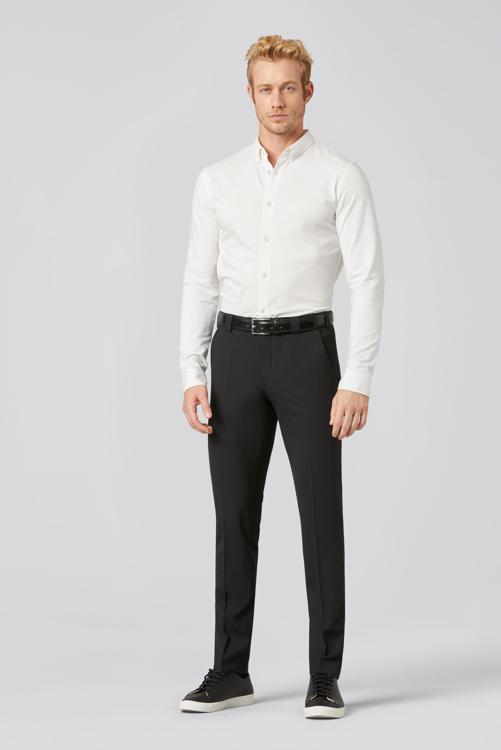 Deze hoogwaardige herenbroek is vervaardigd uit een mix van luxe materialen, waarborgend dat je er niet alleen stijlvol uitziet, maar je ook de hele dag door op je gemak voelt. De broek kenmerkt zich door een elegante, platte voorzijde en traditionele pasvorm, met aandacht voor details zoals de verfijnde afwerking van de zakken en de robuuste sluiting. Dit kledingstuk combineert moeiteloos functioneel design met een modieuze uitstraling, wat het een must-have maakt voor iedere herengarderobe.