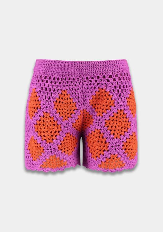 De shorts van Harper & Yve voor dames zijn gemaakt van een luchtig gehaakt materiaal, met een opvallend patroon in oranje en paars. De elastische tailleband zorgt voor een comfortabele pasvorm, terwijl het unieke ontwerp het kledingstuk een boho-chique look geeft. De shorts vallen in de categorie broeken en zijn ideaal voor allerlei zomerse gelegenheden.