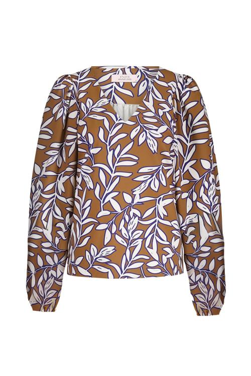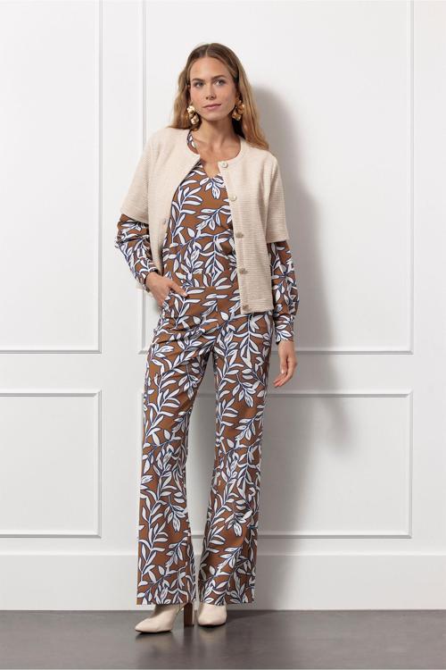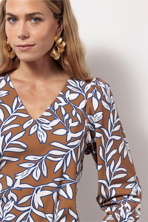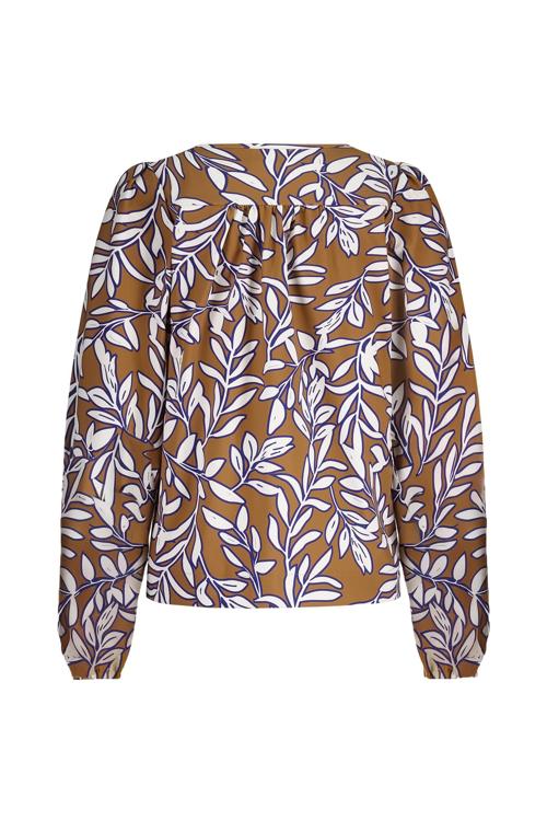 Gemaakt van hoogwaardig materiaal, biedt deze top een comfortabele pasvorm en een ademend gevoel. Het bladpatroon in blauw en wit tegen een warme bruine achtergrond zorgt voor een opvallend design. De ronde halslijn en subtiele sluiting geven een klassieke touch. Ontworpen met oog voor detail, is deze dames top perfect voor diverse gelegenheden.