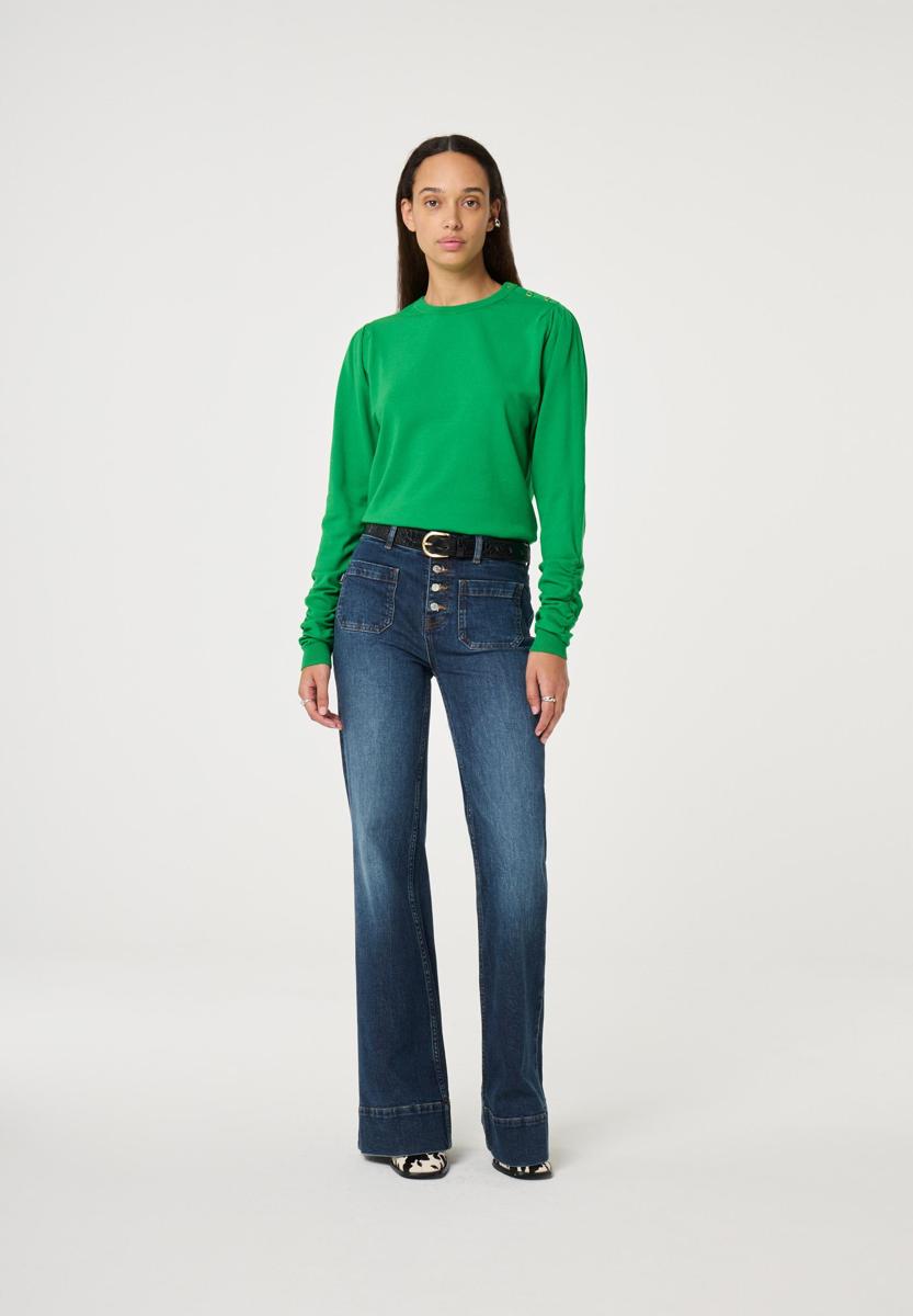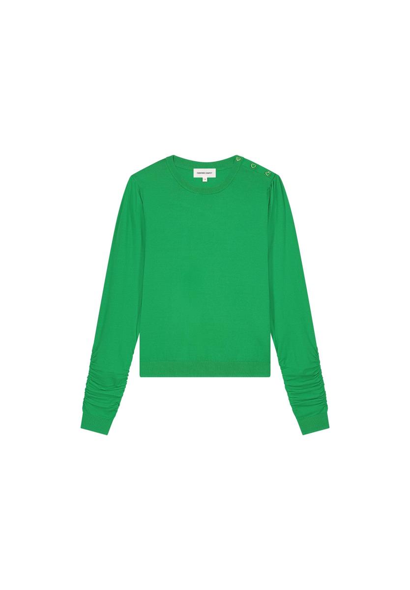 Deze Fabienne Chapot trui biedt een verfijnde uitstraling met zijn levendige groene kleur. Het heeft een eenvoudige ronde halslijn en lange mouwen die perfect aansluiten bij elke gelegenheid. Het kledingstuk is gemaakt van zachte, ademende materialen die zorgen voor optimaal draagcomfort. Aan de achterkant vind je subtiele knoopdetails die een speels accent geven aan dit chique ontwerp.
