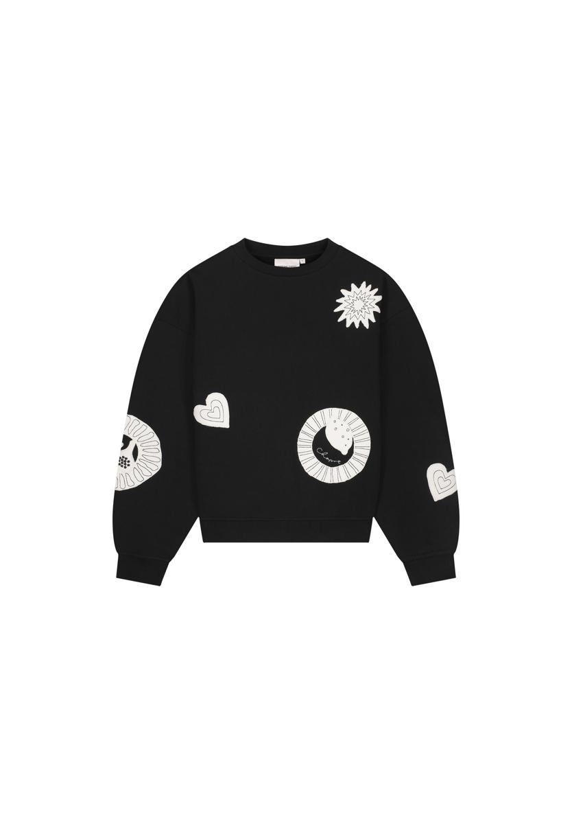 Gemaakt van hoogwaardige materialen, biedt deze trui niet alleen warmte maar ook een unieke uitstraling. De zwarte basis is verrijkt met opvallende witte motieven, waaronder maantjes en bloemen. Met zijn ronde hals en comfortabele pasvorm is het een veelzijdige keuze binnen de categorie Dames, Truien & Vesten.