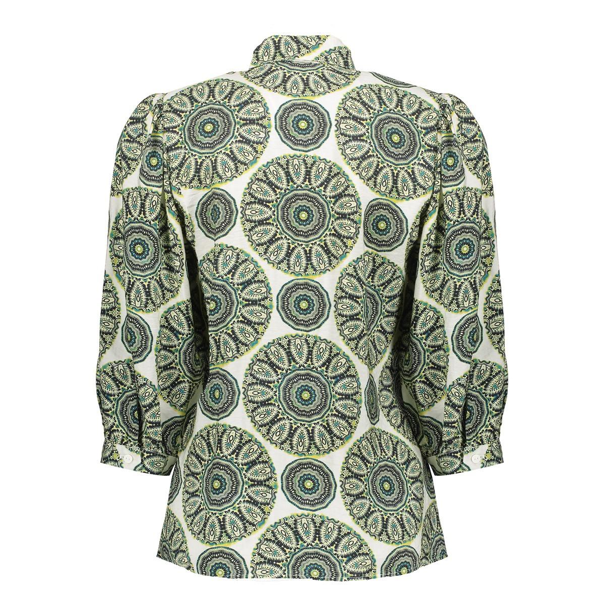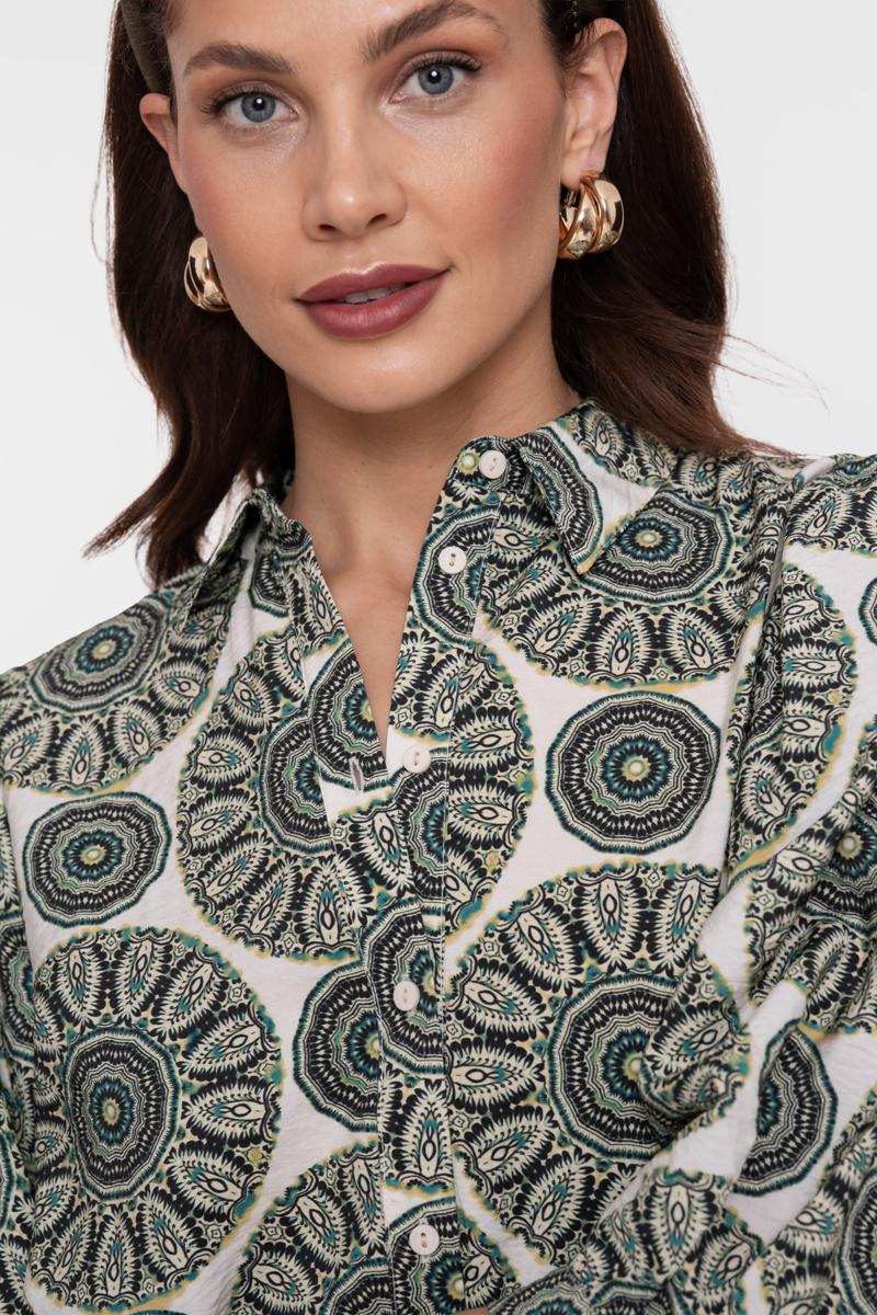 De grafische medaillonprint sluit aan bij de retro- & geo-trend van dit seizoen. Combineer met een zandkleurige chino, donkere denim of een blazer voor werk en diner. Je houdt de look rustig met effen tinten; kies voor groen, ecru of zwart voor harmonie. Speciaal ontworpen voor dames.