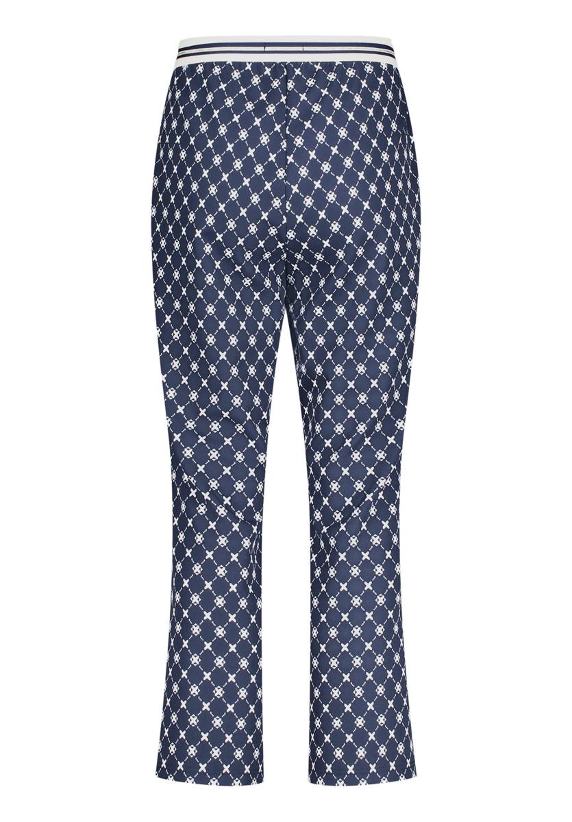 De broek is gemaakt van een zachte stretchkwaliteit die soepel valt. Het instapmodel heeft een comfortabele elastische tailleband met sportieve strepen en een Betty Barclay logo middenvoor. De rechte pijp met subtiele uitloop zorgt voor een elegante lijn. Het all-over grafische dessin in marine & wit oogt modern. De broek heeft geen zichtbare sluiting; je stapt er eenvoudig in. Ontworpen voor dames in de categorie broeken, met de betrouwbare pasvorm van Betty Barclay.