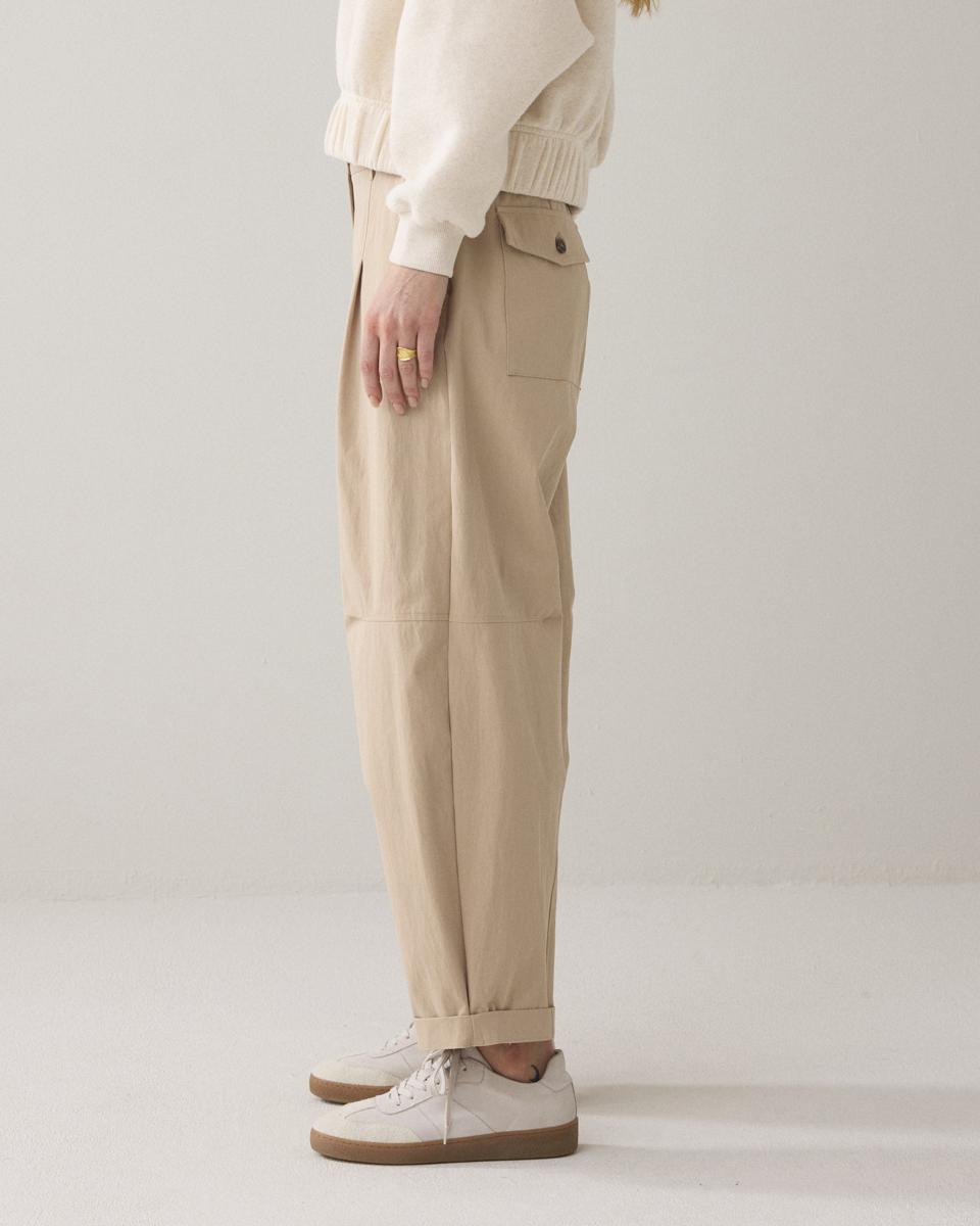 Deze Summum broek is uitgevoerd in een lichte, soepel geweven kwaliteit met matte uitstraling. De rechte, wijdvallende pijp valt cropped op de enkel voor een eigentijds silhouet. Voorzien van schuine steekzakken voor en een klepzak met knoop opzij, plus riemlussen voor een nette taille. De neutrale zandtint maakt combineren eenvoudig en de afwerking is clean zonder opdruk; subtiele knoopdetails zorgen voor een verfijnde look.