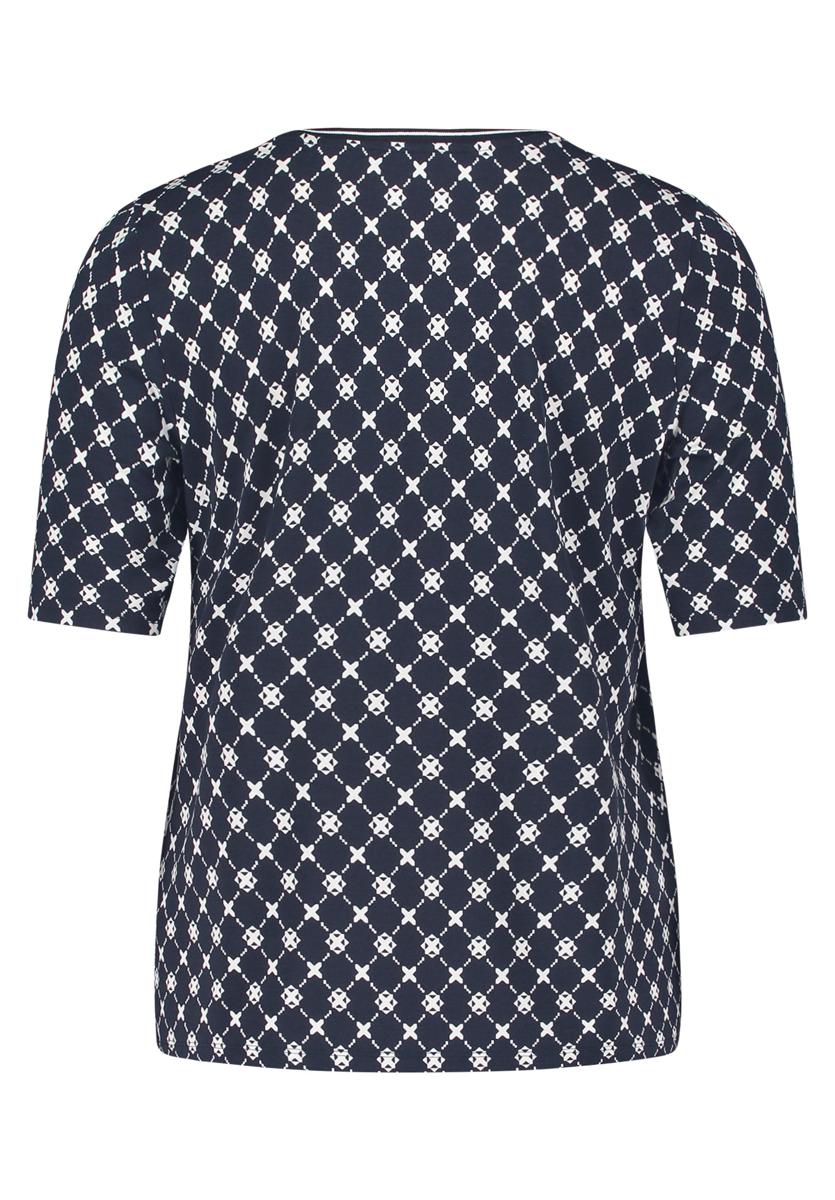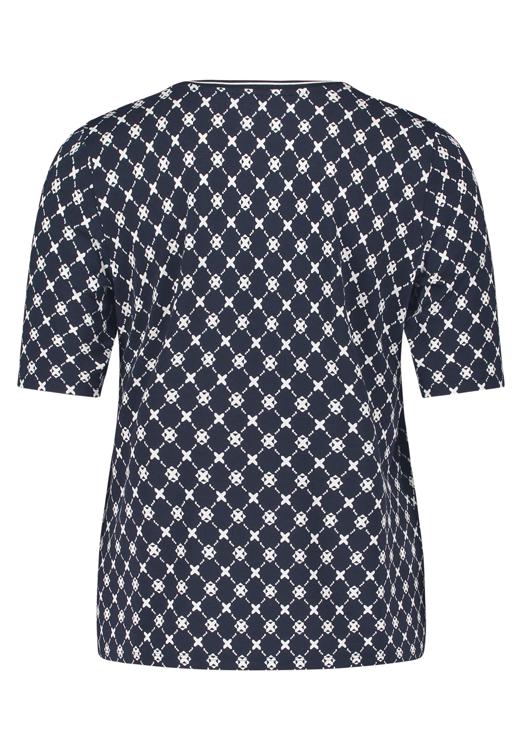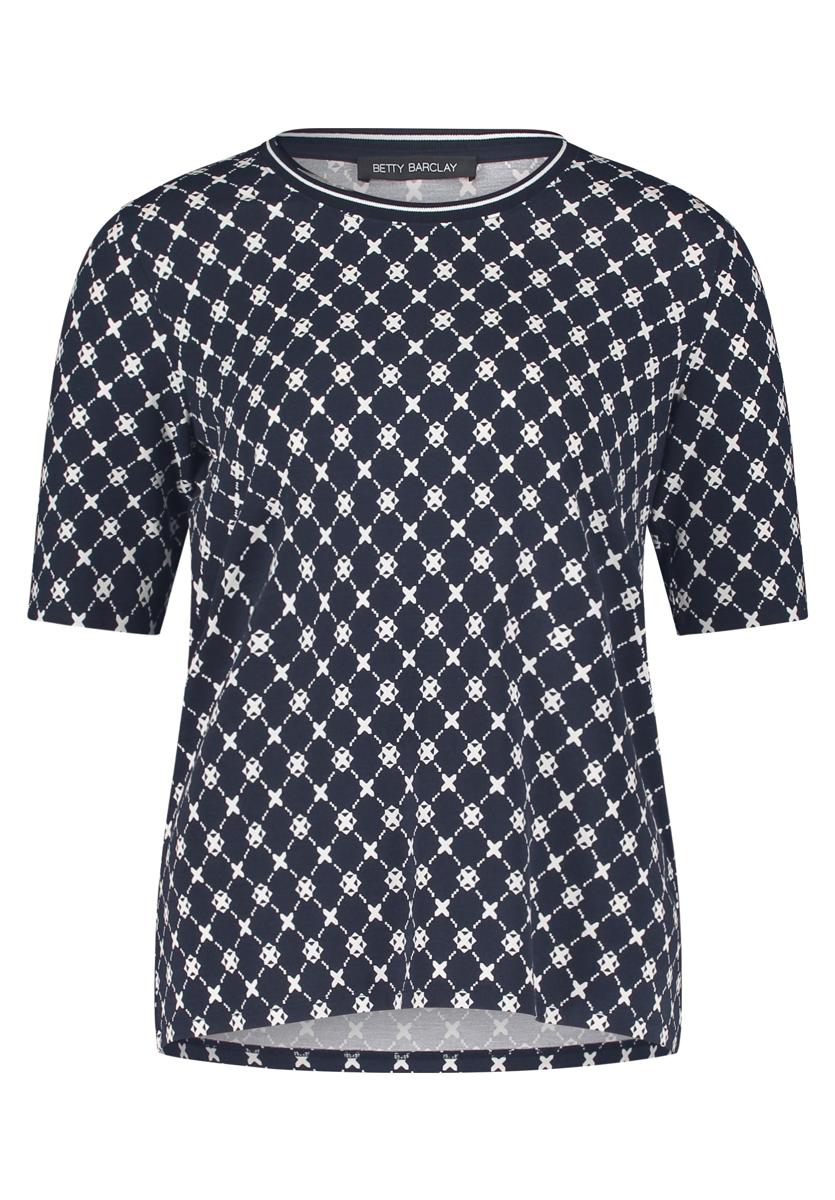 Dit T-Shirt van Betty Barclay is uitgevoerd in een soepele jerseykwaliteit met een all-over grafisch dessin in marine & wit. De ronde hals heeft een smalle, contrasterende bies en het model heeft korte mouwen. Het ontwerp is zonder sluiting, zodat je het gemakkelijk aantrekt. Het rechtvallende silhouet zorgt voor comfortabele draagbaarheid en een verzorgde uitstraling. Een stijlvol kledingstuk binnen de categorie Dames, T-Shirts & Tops van Betty Barclay.