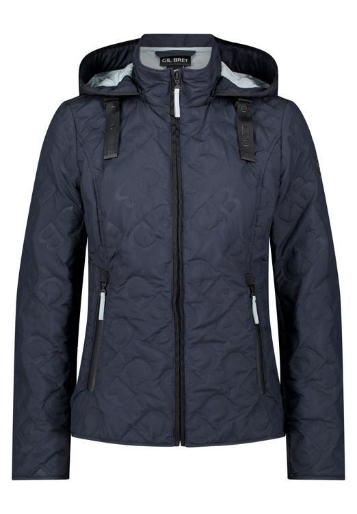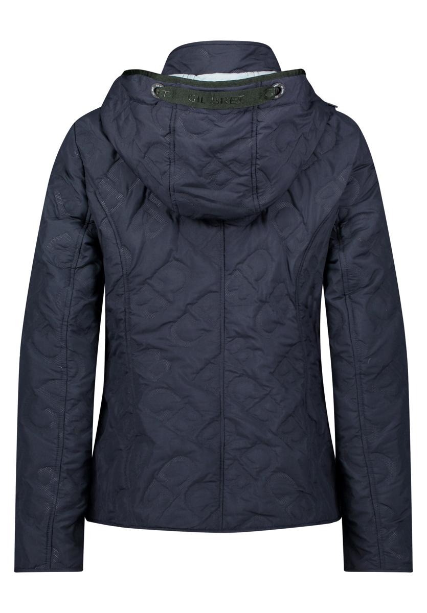 Deze damesjas van Gil Bret is uitgevoerd in donkerblauw met een licht gewatteerde kwaliteit en een gequilt dessin. De opstaande kraag loopt over in een capuchon met aantrekkoord en metalen oogjes. Voorzie van een ritssluiting middenvoor en twee ritszakken voor veilige opbergruimte. De pasvorm is licht getailleerd voor een vrouwelijk silhouet. Op de rand van de capuchon staat het woord Gil Bret. Categorie: Dames, Jassen en Jacks; model: Gil Bret Jack 261-91585230.