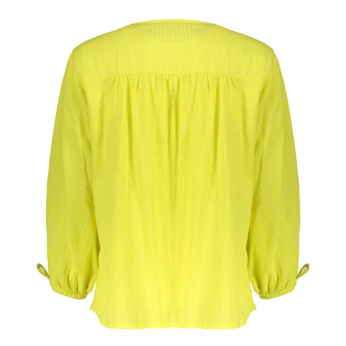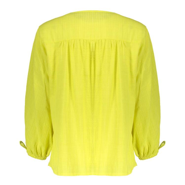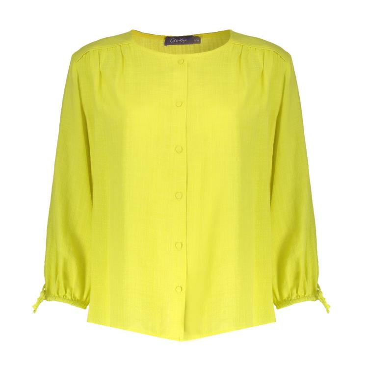 Uitgevoerd in een lichte, luchtige geweven kwaliteit met subtiele textuur. De ronde hals en doorlopende knoopsluiting geven een tijdloos karakter. 3/4-mouwen met lichte uitloop en verstelbare strikkoorden zorgen voor speelse vorm en comfort. Afgeronde zoom en geplooide schouderpas aan de achterzijde voor extra bewegingsruimte. Uni dessin in zonnig geel; geen borstzakken, geen zichtbaar logo. Een veelzijdig kledingstuk binnen de Geisha collectie.