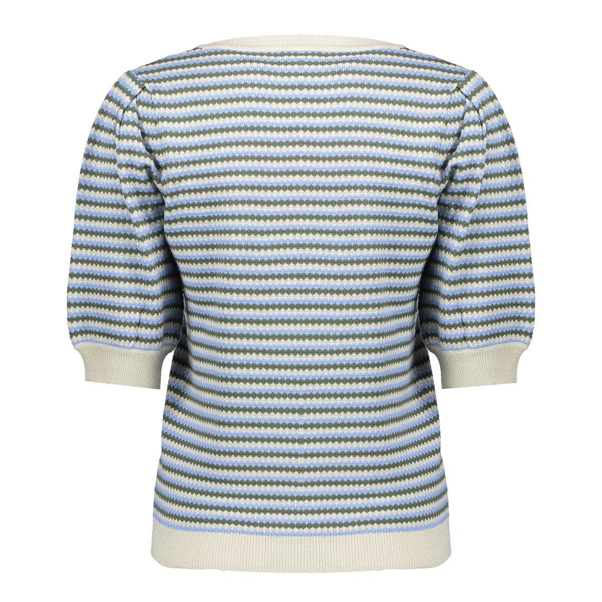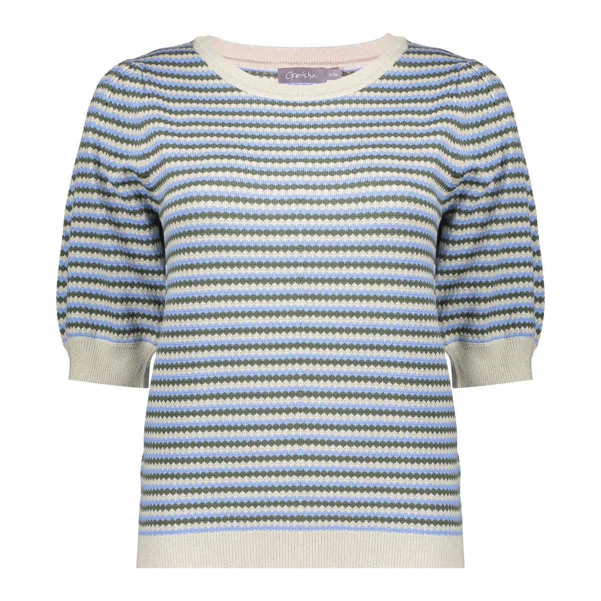 Je kiest voor een fijngebreide trui met een ronde hals en een zacht ribboord in een lichte tint. Het horizontale streepdessin in blauw met subtiele contrastkleuren oogt fris en verzorgd. De halflange mouwen hebben ribmanchetten; de zoom is afgewerkt met ribboord voor een nette pasvorm. Sluiting: geen, je trekt de trui eenvoudig aan. Zakken: geen. Logo: niet zichtbaar. Merk: Geisha. Categorie: Dames, Truien & Vesten.