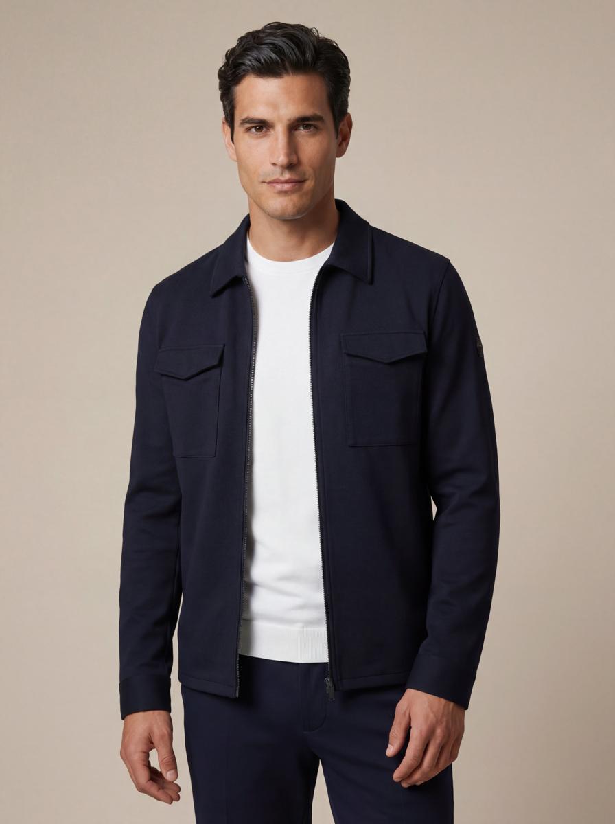 De navy kleur combineer je moeiteloos met een grijze chino, donkerblauwe jeans of een nette pantalon. Draag het open over een T‑shirt of gesloten als overhemd; perfect voor kantoor, stedentrips & etentjes. De minimalistische belijning, borstzakken en rits zorgen voor een moderne Heren uitstraling die naadloos past bij je garderobe.