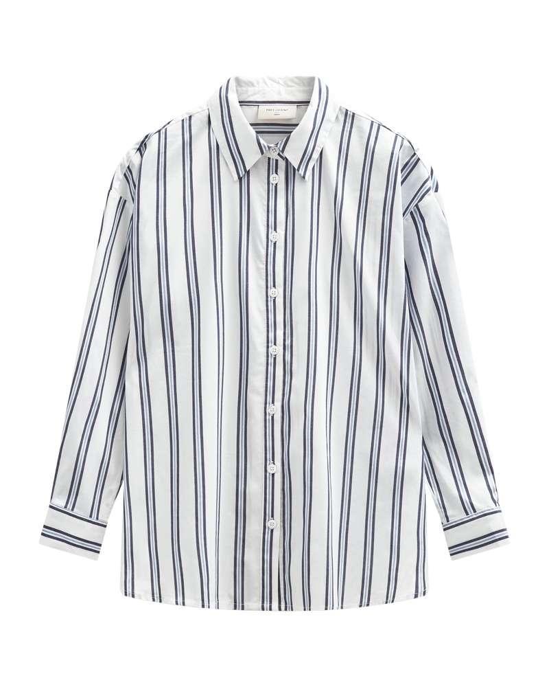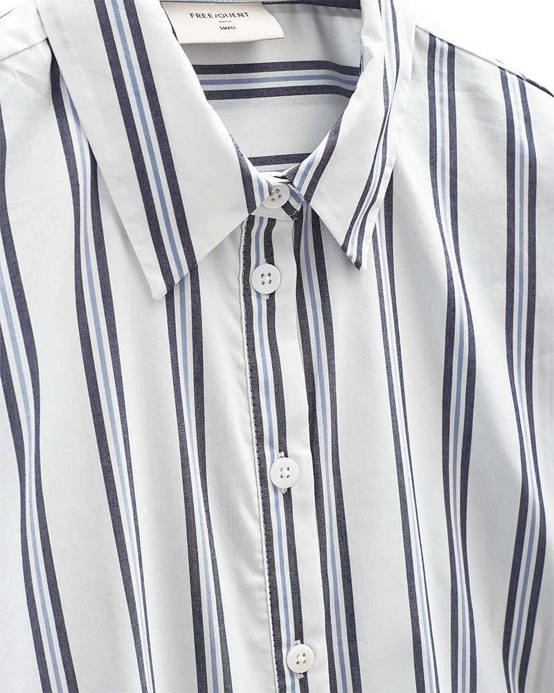 Deze damesblouse van FREEQUENT valt licht en soepel en toont een wit grondvlak met verticale marineblauwe strepen. De blouse heeft een klassieke kraag, een doorlopende knoopsluiting met witte knopen, lange mouwen en manchetten met knoop. Achterzijde met schouderpas en stolpplooi voor extra bewegingsruimte, rechte zoom, geen borstzakken. Categorie: Dames, Blousen & Tunieken. Een veelzijdig kledingstuk dat netjes oogt en comfortabel draagt.