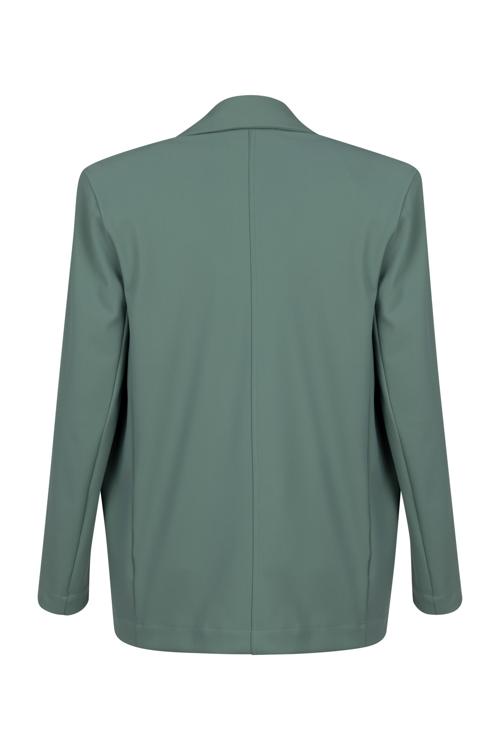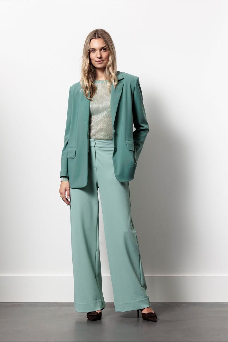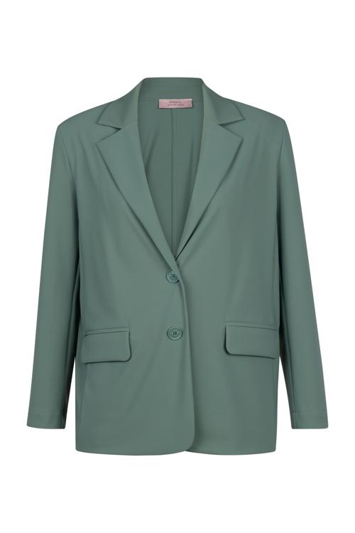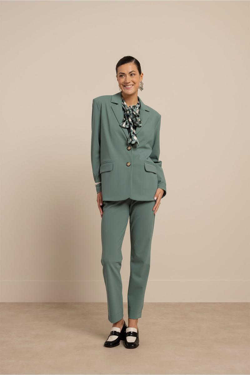 Deze blazer is uitgevoerd in een stevige bonded kwaliteit die soepel valt en vormvast oogt. Het ontwerp heeft een klassieke reverskraag, een tweeknoops sluiting en twee voorzakken met klep. De lange mouwen en het effen dessin in een zachte groentint geven het kledingstuk een tijdloze uitstraling. De subtiele middennaad achter zorgt voor een nette lijn. Een veelzijdige dames blazer van Studio Anneloes die je garderobe direct versterkt en die via onze webshop of in de winkel bij Steegenga Mode in Friesland te koop is.