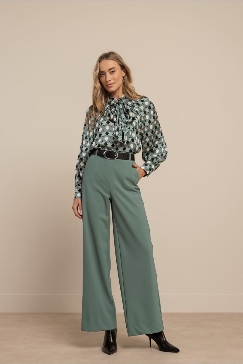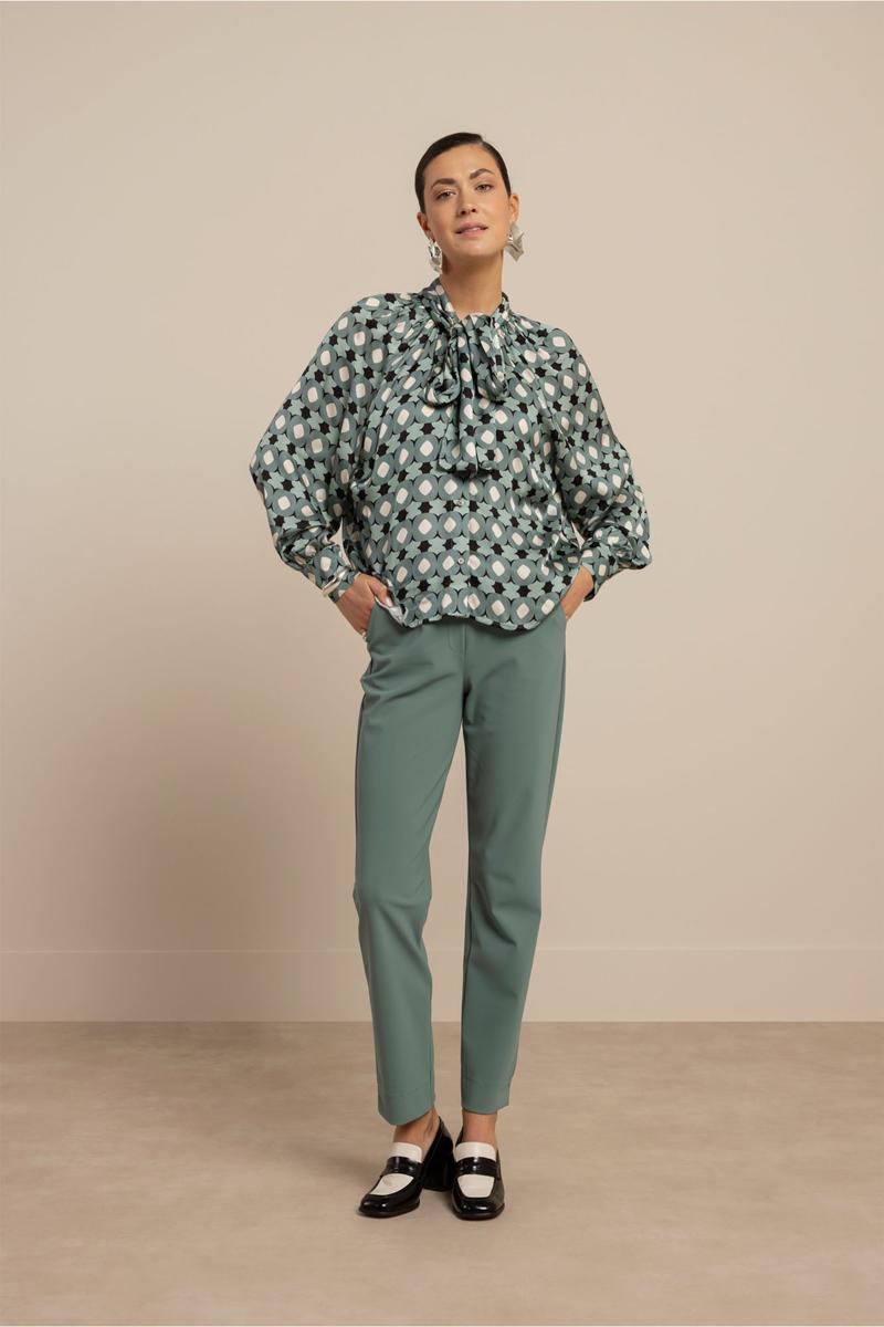 Deze dames blouse is gemaakt van een soepelvallende, lichte kwaliteit die mooi meebeweegt. De hoge hals met strikdetail en fijne rimpels geeft een verfijnde uitstraling. Je trekt het model aan zonder zichtbare knoopsluiting aan de voorkant. Het grafische cirkeldessin in groentinten met ecru & donkere accenten maakt het kledingstuk onderscheidend. De lange mouwen hebben een nette manchet en de rechte zoom zorgt voor een verzorgde look. Geen zakken. Van Studio Anneloes.