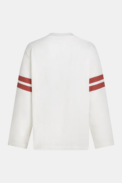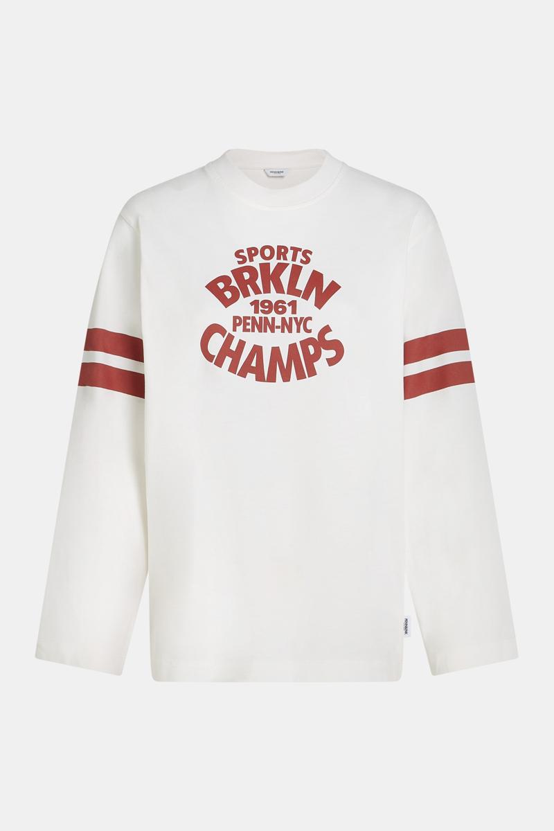 De top is uitgevoerd in zacht jersey, heeft een ronde hals en lange mouwen, en sluiting ontbreekt voor een clean silhouet. De voorzijde toont een rode borstprint met de tekst: SPORTS BRKLN 1961 PENN-NYC CHAMPS. Op beide mouwen lopen twee rode strepen; de zoom is recht en zonder zakken. Het kleurbeeld is fris wit met rood accent, kenmerkend voor Penn & Ink N.Y. Een veelzijdig kledingstuk dat comfortabel draagt en een duidelijke sportreferentie toevoegt.