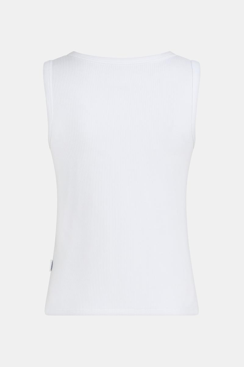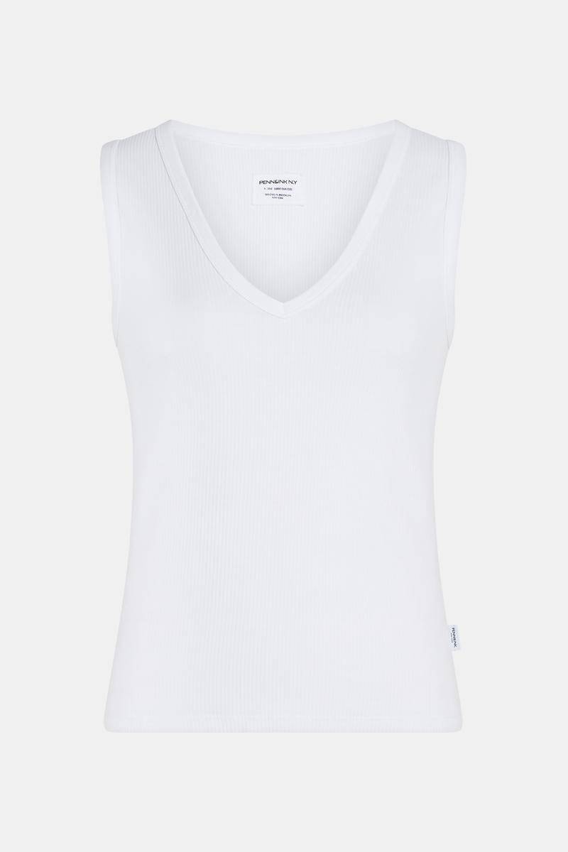 Deze top van Penn & Ink N.Y is uitgevoerd in een effen witte kleur en heeft een flatterende V‑hals. Het mouwloze ontwerp zonder sluiting oogt clean en voelt comfortabel door de soepele, licht rekbare kwaliteit. Fijn afgewerkte randen en een subtiel merklabel in de zijnaad geven het kledingstuk een verfijnde touch. Een tijdloze basic die je moeiteloos solo draagt of als laagje onder een blazer of overhemd.