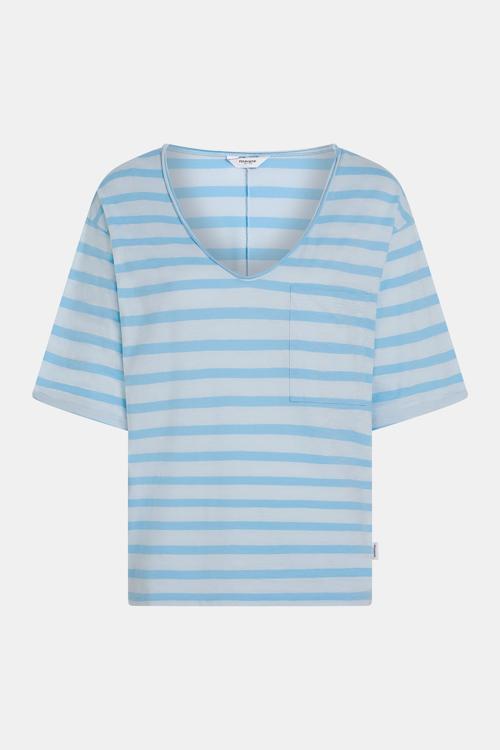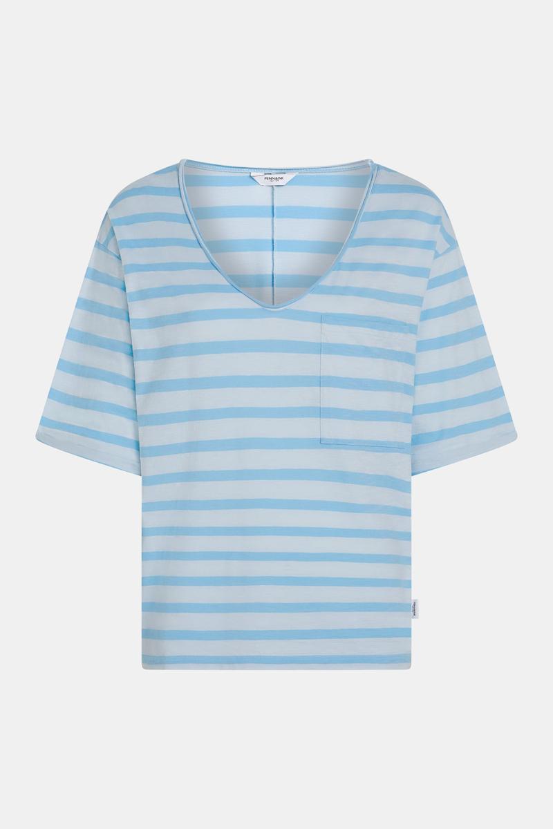 Deze dames top heeft een V-hals, korte mouwen en een relaxed, licht boxy silhouet. Het horizontale gestreepte dessin in lichtblauw met wit zorgt voor een frisse look. Voorzien van een opgestikte borstzak en rechte zoom; zonder sluiting voor een clean aan- en uittrekken. Subtiel merklabel aan de zijnaad. Gemaakt van een soepele kwaliteit die comfortabel aanvoelt-een kledingstuk van Penn & Ink N.Y binnen Dames, T‑shirts & tops.