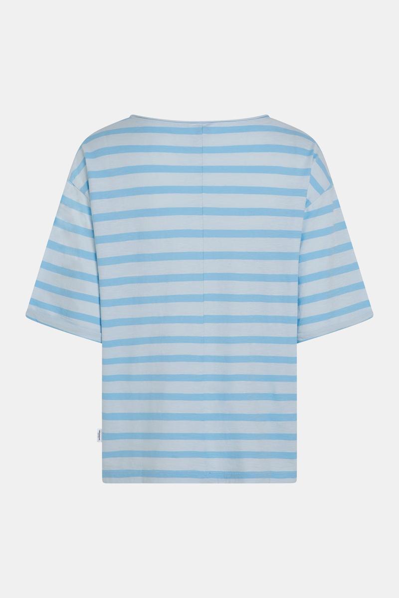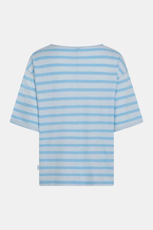 De strepen & pastelblauw sluiten aan op de nautical en soft‑tone trend. Je combineert deze dames top met een linnen broek, high‑waist denim of onder een oversized blazer; sneakers of sandalen maken het af. Draag hem naar werk, weekend of citytrip. Voorraad is seizoensgebonden, dus wacht niet te lang.