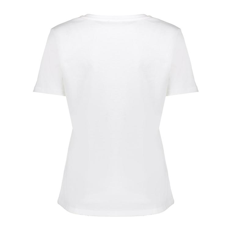 Met zijn schone ontwerp en blauwaccenten sluit dit dames T-shirt aan bij de modern graphic tee-trend. Combineer met een donkerblauwe blazer en jeans voor kantoor, of met een linnen broek of midi-rok in het weekend. De witte basis en ronde hals laten sieraden subtiel spreken. Draagbaar in elk seizoen.