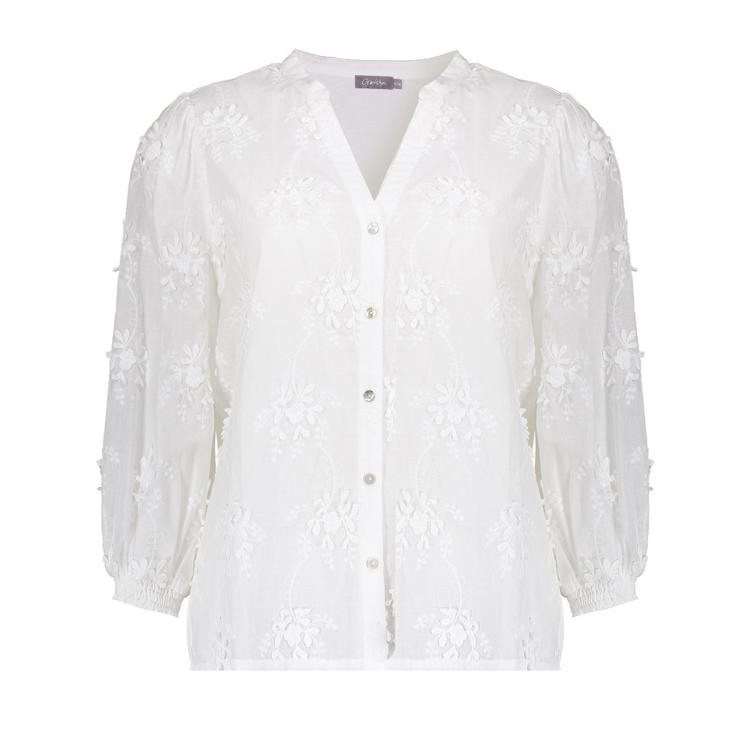 De blouse van Geisha is uitgevoerd in een luchtige, geweven kwaliteit met subtiele, ton-sur-ton bloemstructuur. Het model heeft een V-hals met verfijnd opstaand kraagje, een doorknoopsluiting met knopen voor en 3/4 mouwen met elastische manchetten. Zonder zakken en zonder zichtbaar logo, voor een rustige uitstraling. Draagbaar als Dames blouse binnen de categorie Blousen & Tunieken; elegant en tijdloos.