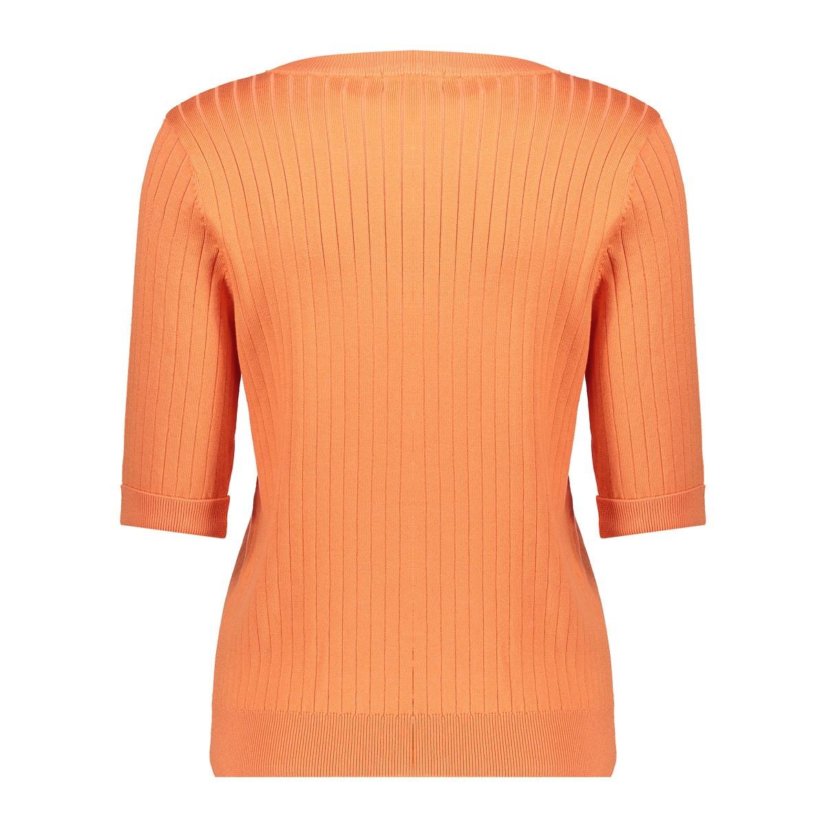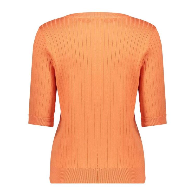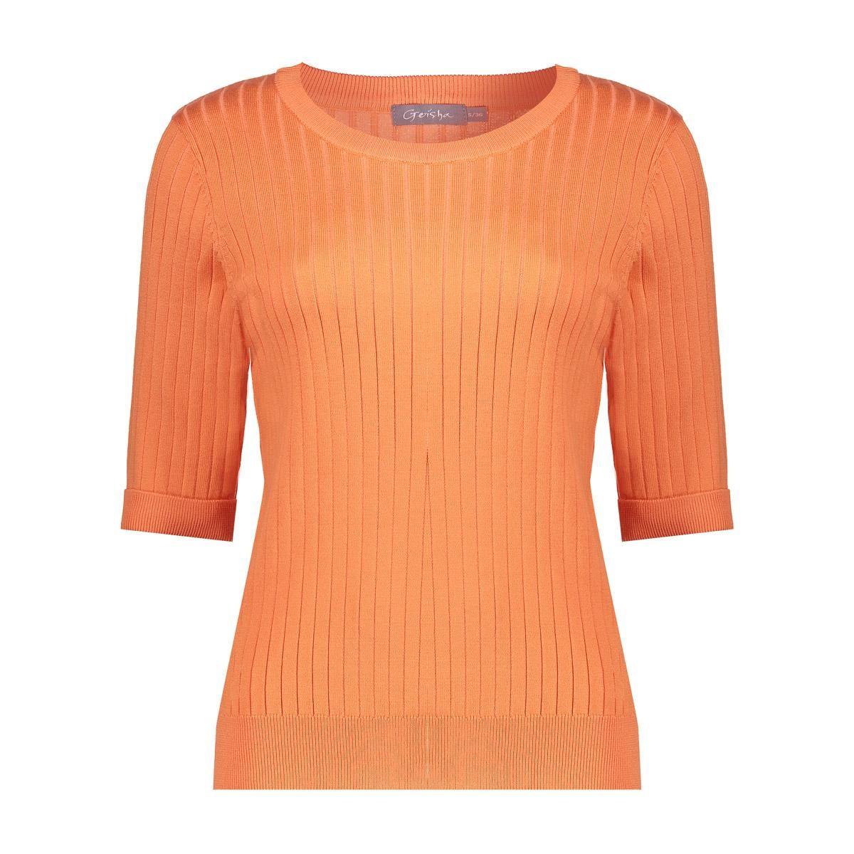 Deze fijngebreide dames trui in levendig koraal heeft een ronde hals en halflange mouwen. De verticale ribstructuur flatteert en voelt comfortabel. Het model valt recht, met geribde boorden, en is een pullover zonder sluiting-aan & klaar. Effen dessin, geen zakken of opvallende logo’s, waardoor je het kledingstuk moeiteloos combineert. Van het merk Geisha. Artikel: Geisha Trui 64064-14.