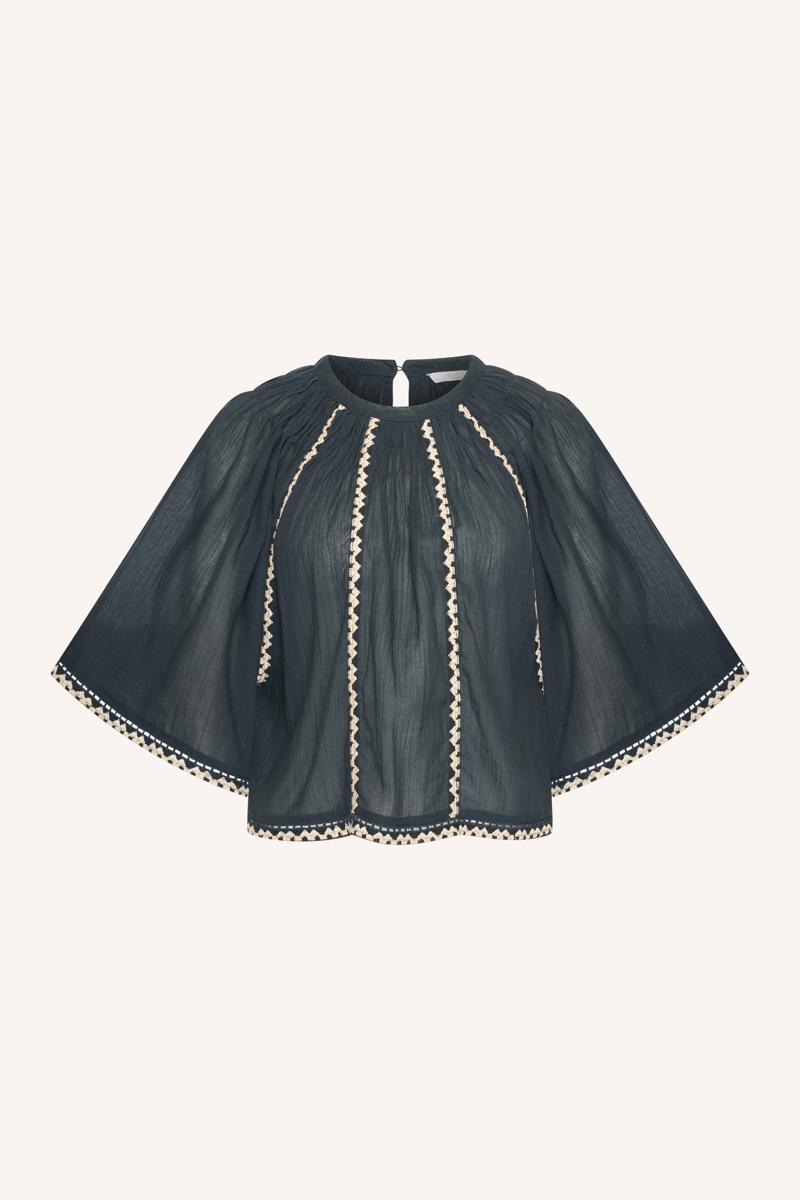 Eigentijdse boho is terug: volume, lichtheid en contrastbiezen horen bij deze Dames trend. De donkerblauwe tint met ecru details voelt nieuw en fris. Je combineert de blouse met een wijde pantalon, een straight jeans of een midi-rok; voor werk met een blazer, voor weekend met sandaal of sneaker. Perfect voor lentedagen en zwoele avonden.