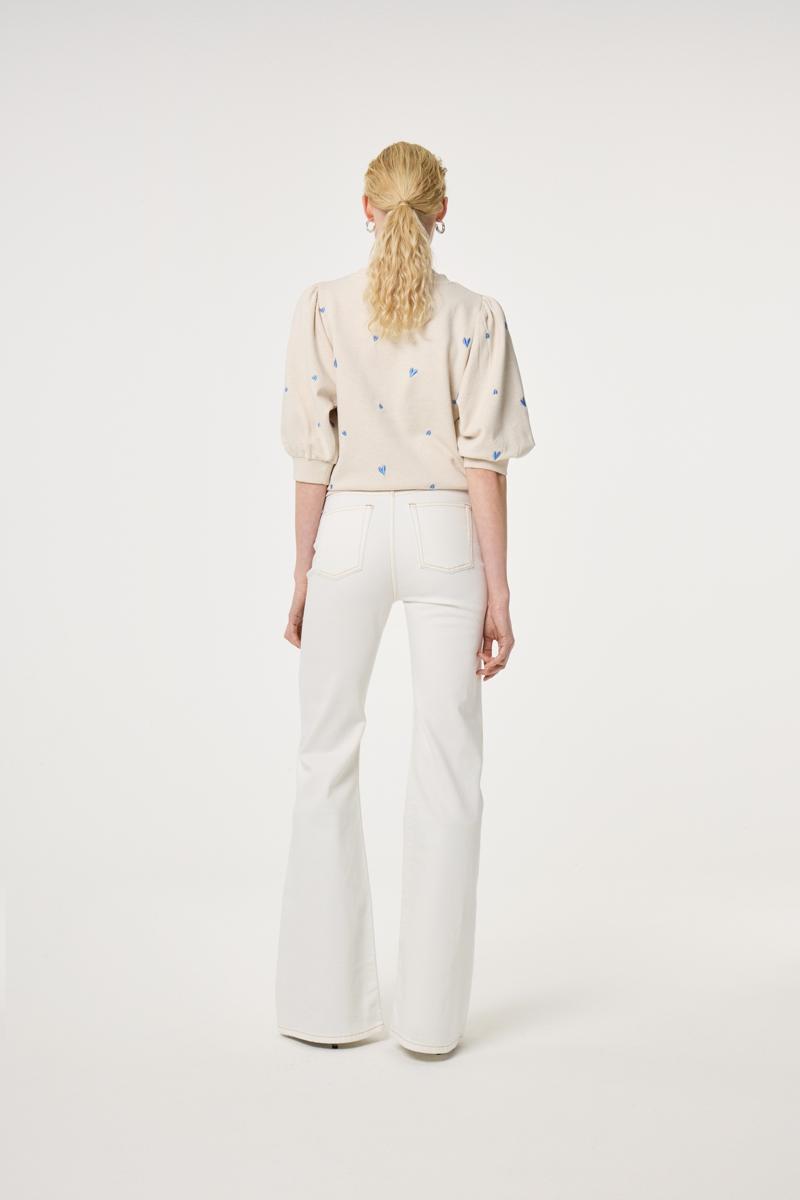 Deze Fabienne Chapot trui in zachte sweatkwaliteit voelt comfortabel en oogt verfijnd. Het kledingstuk heeft een ronde hals, ribboorden en een rechte zoom. Pofmouwen tot net over de elleboog met elastische manchetten zorgen voor een moderne vorm. Het dessin bestaat uit fijn geborduurde blauwe hartjes. Je trekt de trui eenvoudig aan; zonder sluiting of zakken. Geliefde stijl van Fabienne Chapot, vaak snel uitverkocht-wacht niet te lang.