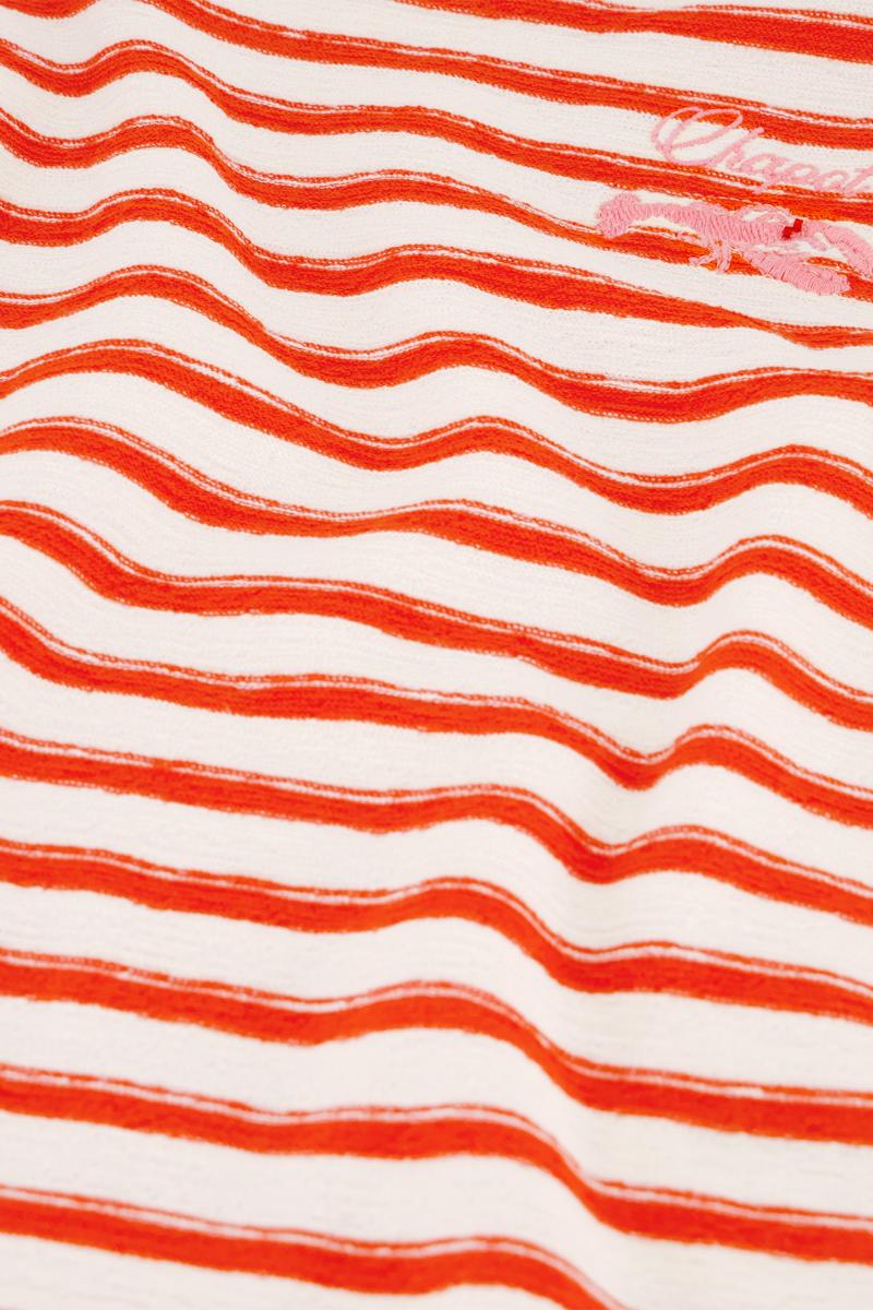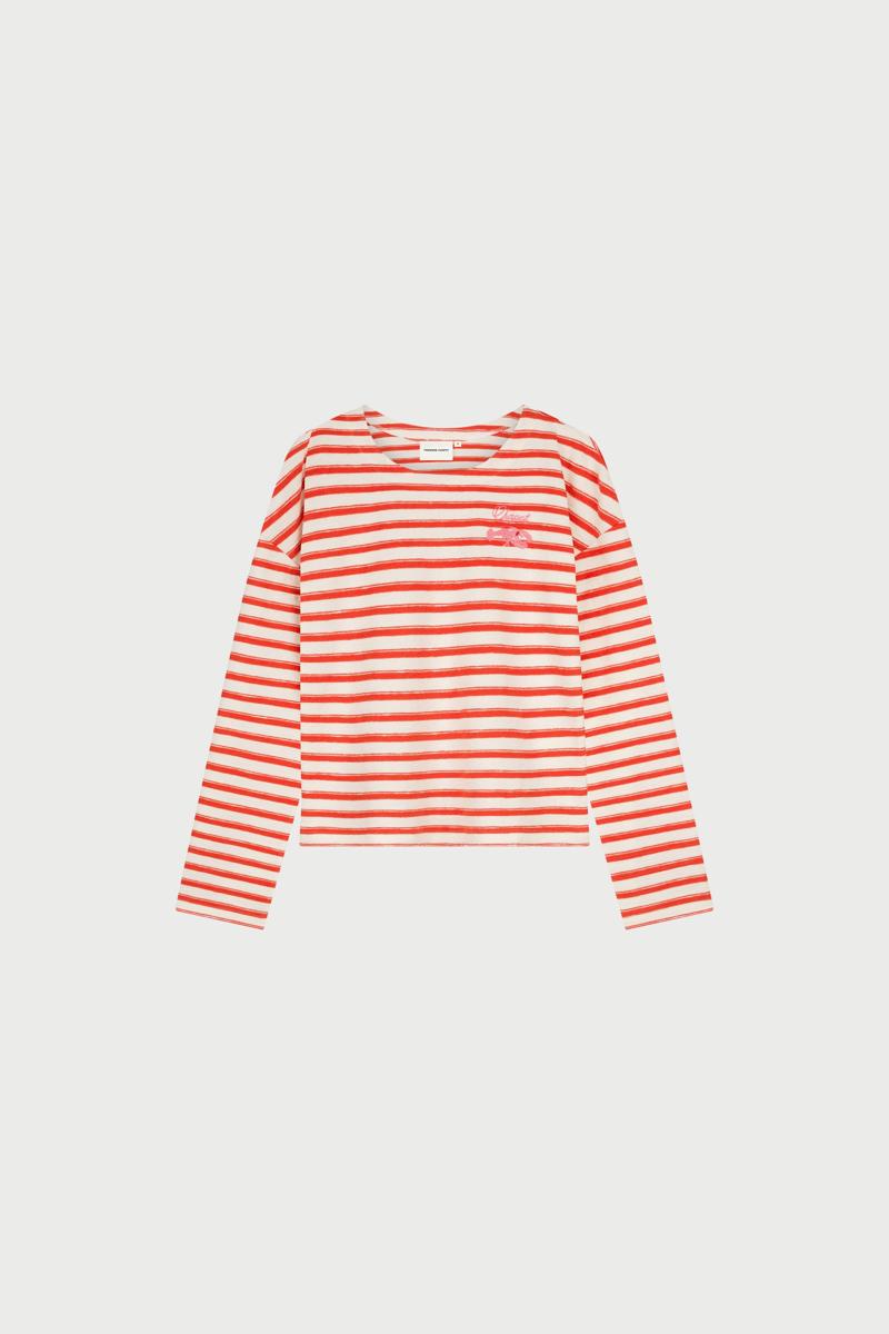 Deze top van Fabienne Chapot is uitgevoerd in een soepele jersey die prettig aanvoelt op de huid. Het model heeft een ronde hals, lange mouwen en geen sluiting, zodat je ’m gemakkelijk aantrekt. Het rood‑wit streepdessin geeft het kledingstuk een tijdloze uitstraling. Op de borst prijkt subtiel het geborduurde woord Chapot als logo-accent. De afwerking is clean met een rechte zoom, ideaal voor Dames in de categorie T-Shirts & Tops.