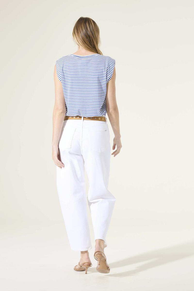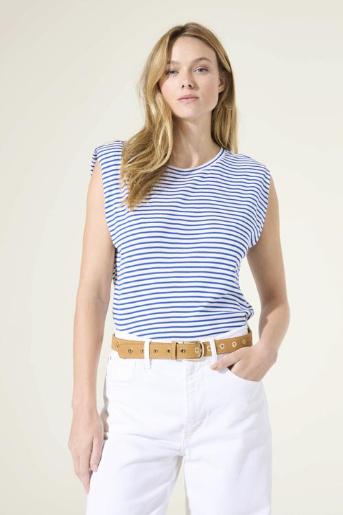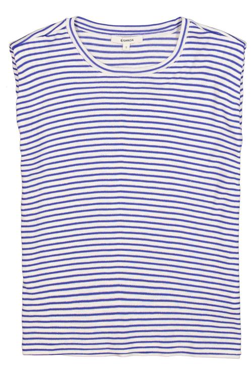 Je kiest voor een zacht aanvoelende jersey met ronde hals en een mouwloos ontwerp met licht verlengde schouders. Het blauw‑wit gestreepte dessin geeft dit kledingstuk een frisse, tijdloze look. Geen sluiting, geen zakken: je schiet het gemakkelijk aan. De halsboord is netjes afgewerkt en de pasvorm valt recht voor comfort, elke dag. Een moderne essential van Garcia. Nu te koop via de webshop of in de winkel bij Steegenga Mode in Friesland.