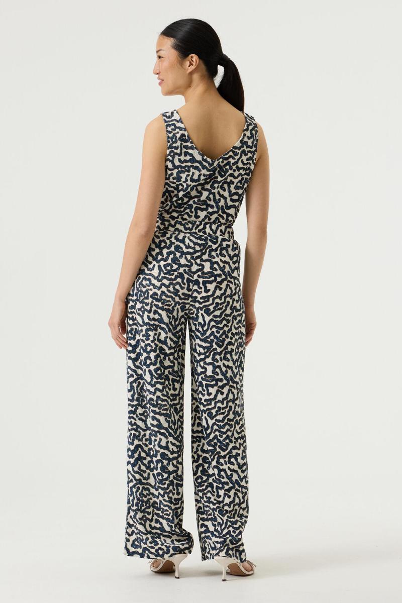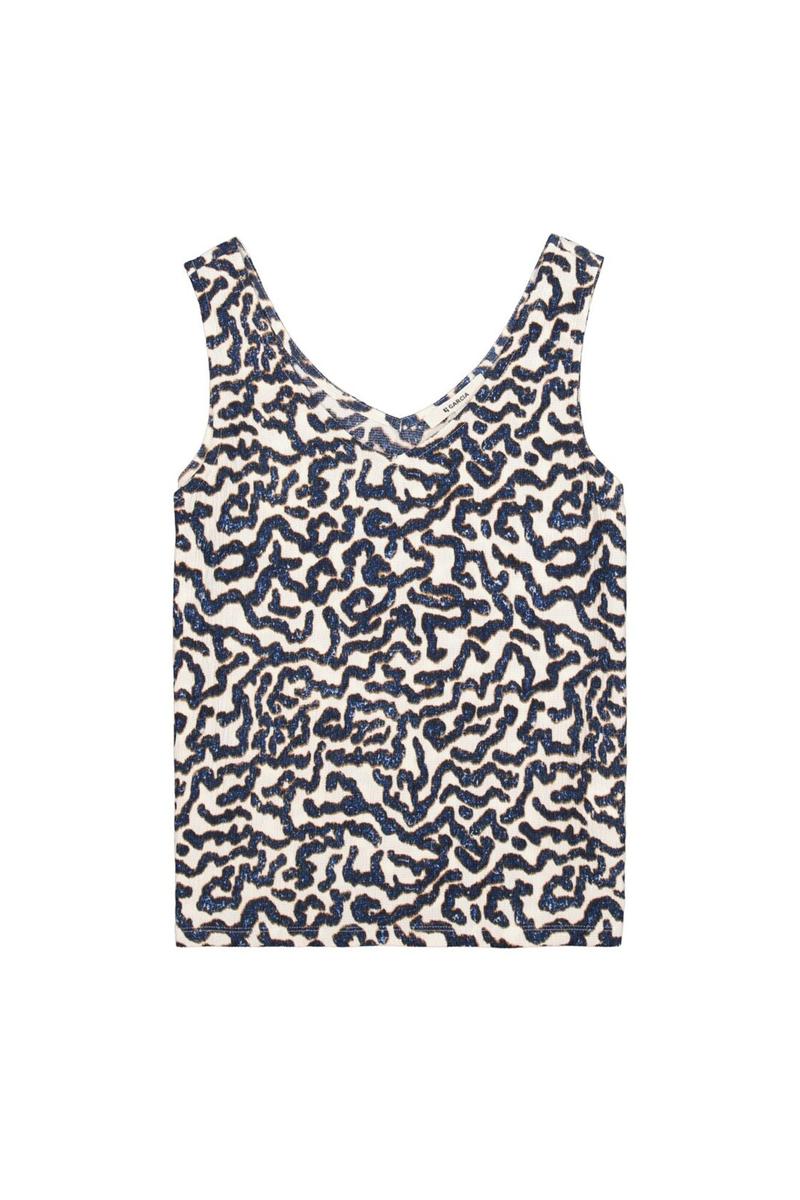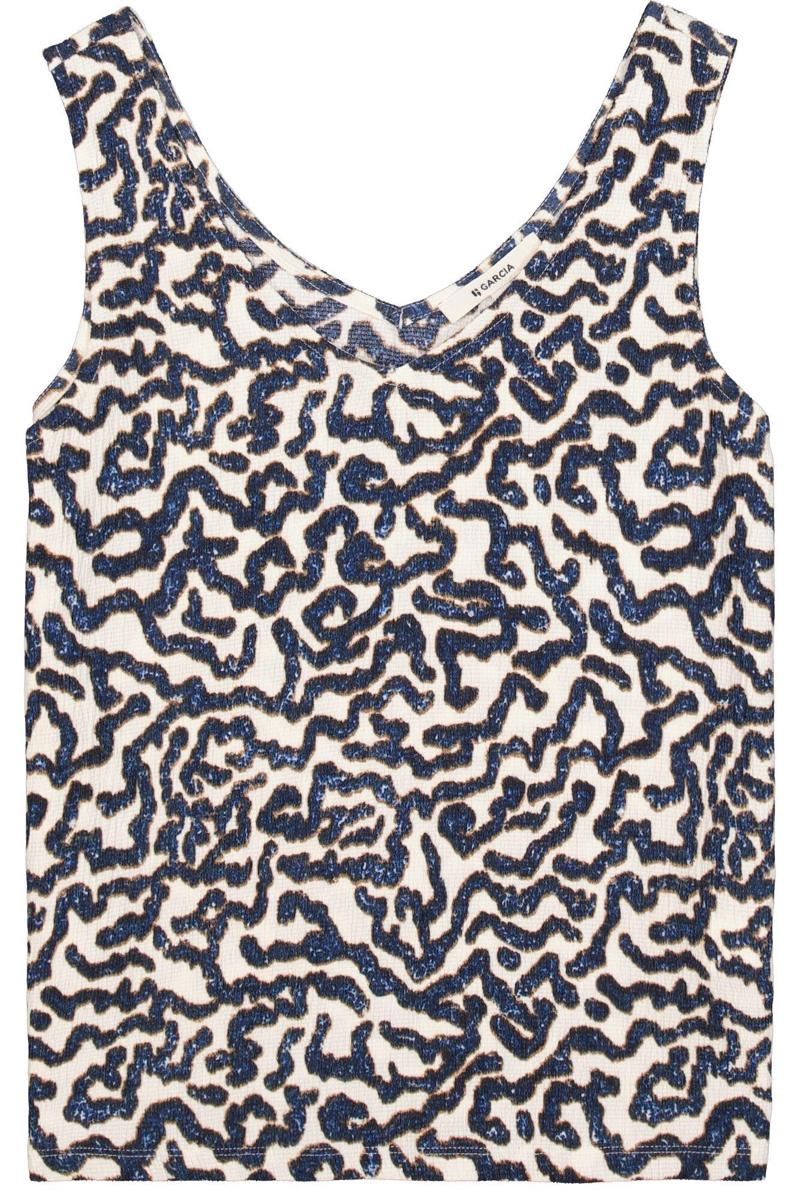 Deze Garcia top voor Dames valt soepel en is mouwloos. De V-hals aan de voor- & achterkant geeft een elegante lijn. Het instapmodel heeft geen sluiting en een rechte zoom. Opvallend is het all-over abstracte animal dessin in donkerblauw op ecru, met subtiele glans door pailletten. De licht geplooide, geribde kwaliteit draagt comfortabel en behoudt mooi vorm. Categorie: Dames, T-Shirts & Tops. Merk: Garcia.