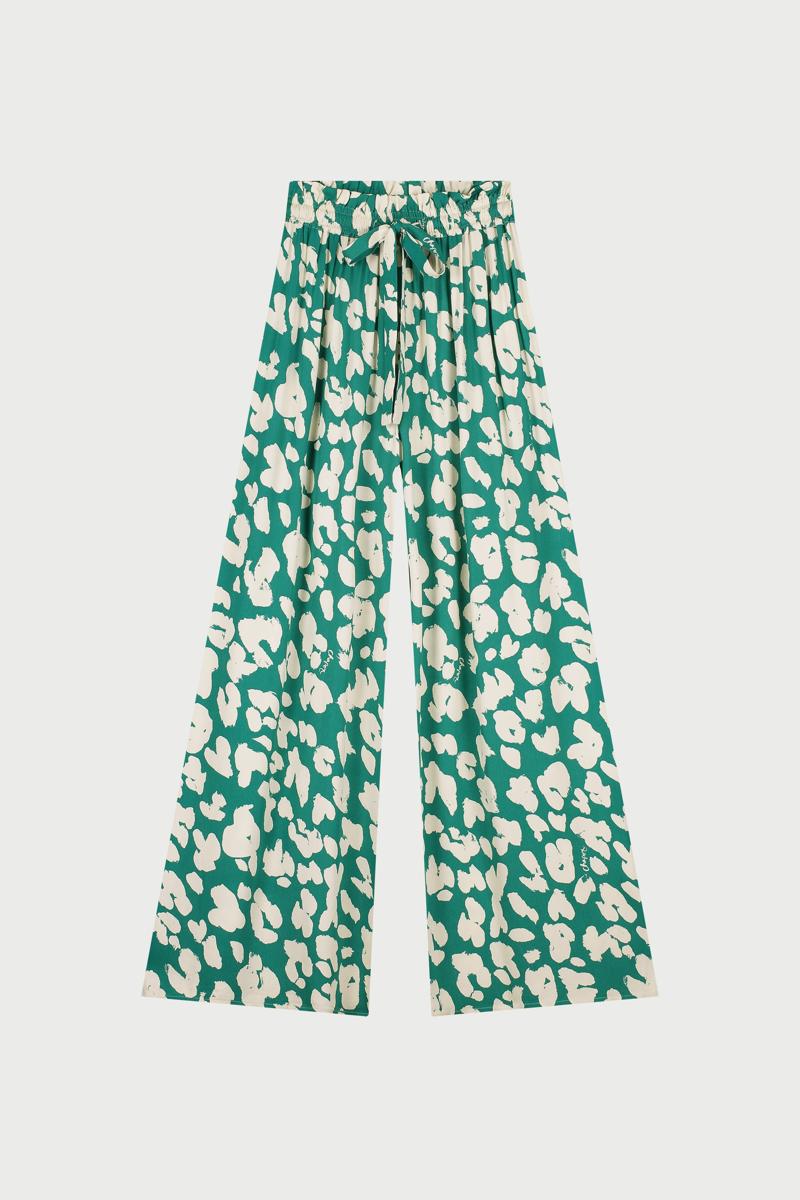 Dankzij de wijde pijp & paperbag taille past deze dames broek in de wide-leg en dopamine dressing trend. De frisse groentint en speels dessin werken zowel casual als feestelijk. Combineer met een wit T-shirt of satijnen blouse, sandalen of sneakers; voor avond met hakken en een blazer. Draag naar kantoor, citytrip of een brunch.