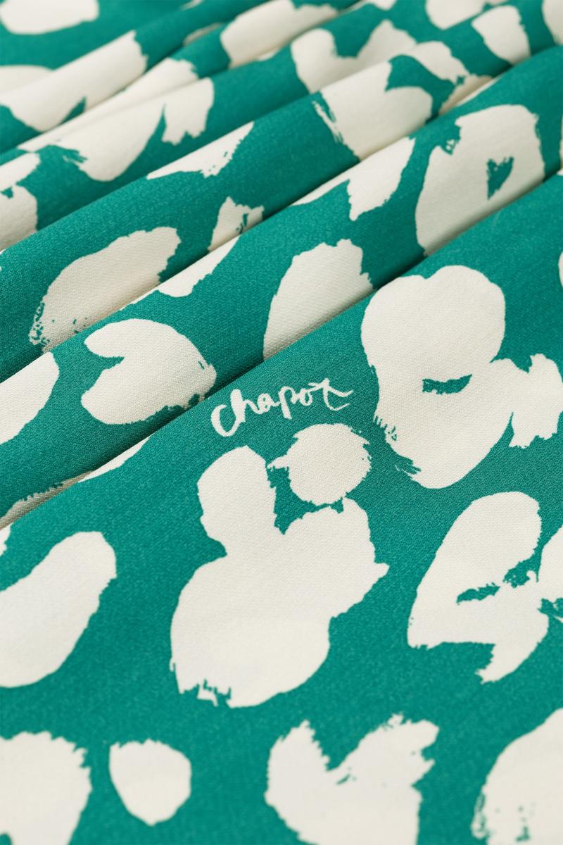 Deze Fabienne Chapot dames broek valt soepel en heeft een high-waist paperbag taille met elastiek en strikkoordsluiting. De rechte, extra wijde pijpen geven luchtige beweging. De groene basis is versierd met een crèmekleurig all-over dessin; tussen de vlekken lees je subtiel het woord “Chapot”. Het comfortabele ontwerp is licht en zacht, ideaal voor dagelijks dragen. Zonder zichtbare rits. Naam: Fabienne Chapot Broek CLTTRS31SS260249, categorie: Dames, Broeken. Merk: Fabienne Chapot.