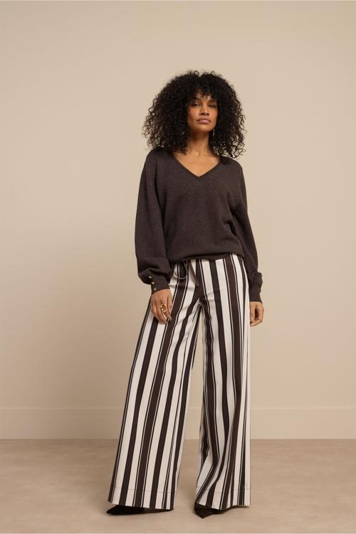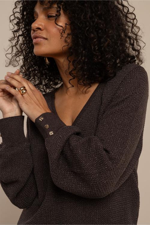 De textuur en de verfijnde V-hals sluiten aan bij de quiet-luxury trend in knitwear. In een donkere, neutrale tint combineer je deze dames trui makkelijk: met een wijde pantalon, leren midi-rok of je favoriete jeans; solo of over een top of blouse. Perfect voor kantoor, weekend & diner, het hele seizoen door.