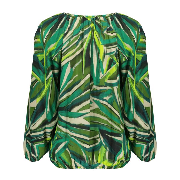 Deze top van Geisha is gemaakt van een luchtige, soepelvallende geweven kwaliteit. De ronde hals heeft een strikkoord met een kleine V-opening. De lange, licht ballonvormige mouwen eindigen in elastische manchetten voor een elegante vorm. Het allover bladdessin in frisse groentinten geeft het kledingstuk een levendige uitstraling. Het model is zonder zakken en zonder knoopsluiting, waardoor je het eenvoudig aantrekt en het comfortabel valt.