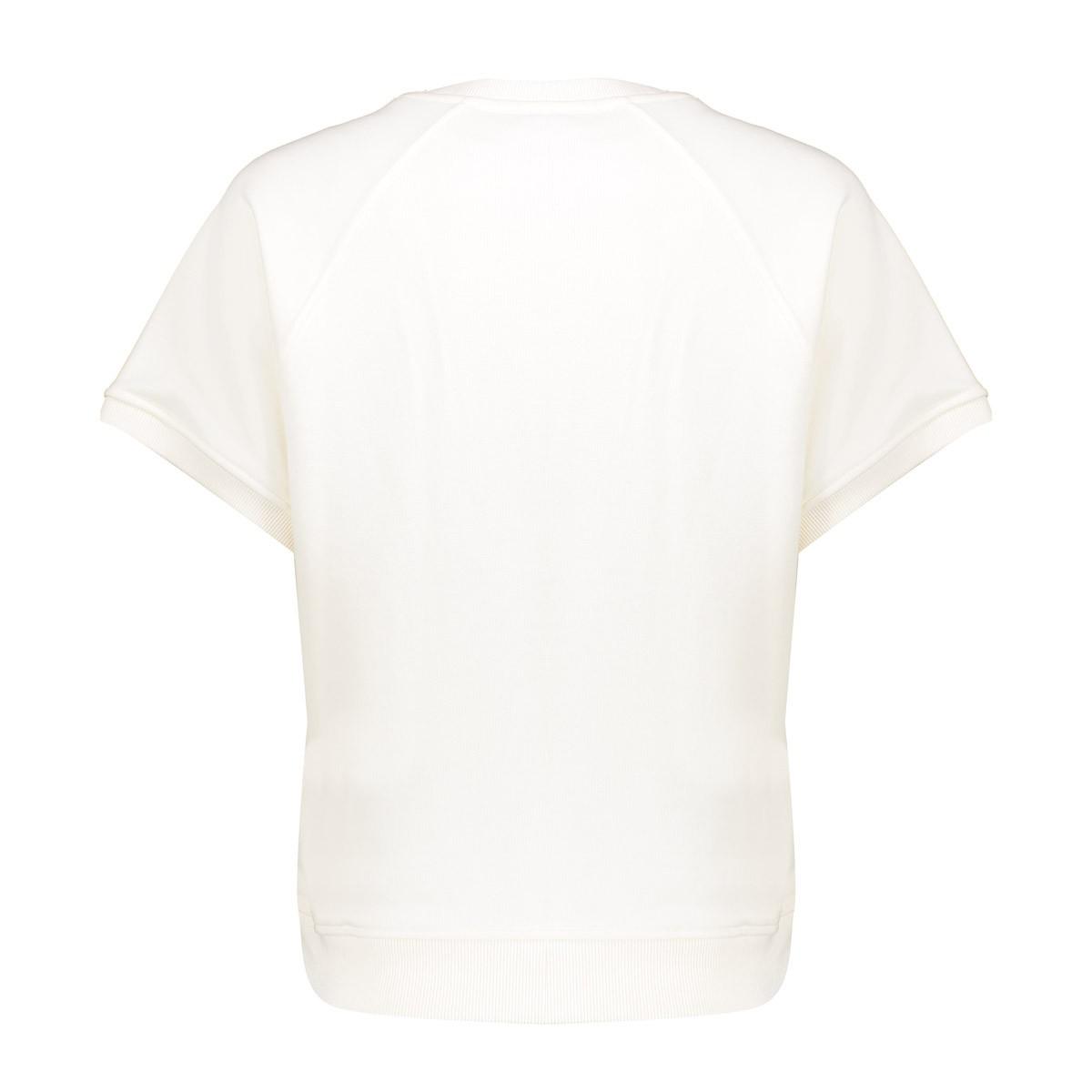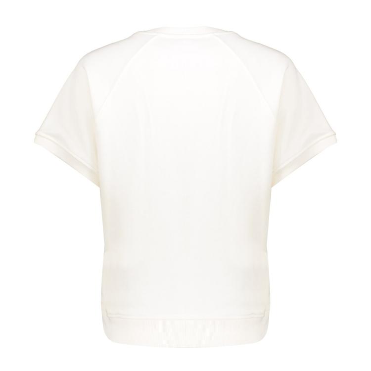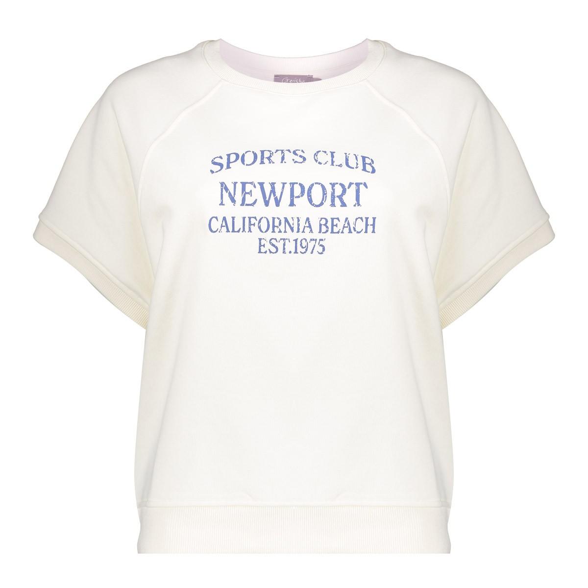 Deze sweater in zachte sweatkwaliteit heeft een ronde hals met fijn ribboord, korte raglanmouwen en een comfortabele, elastische zoom. De voorkant toont een blauwe tekstprint: “SPORTS CLUB NEWPORT CALIFORNIA BEACH EST. 1983” voor een frisse, sporty look. Het ontwerp is zonder sluiting en zonder zakken, voor een clean silhouet. De kleur is licht ecru en de stof voelt soepel aan. Als Dames trui van Geisha geeft dit kledingstuk een relaxte pasvorm die mooi op heuphoogte valt.