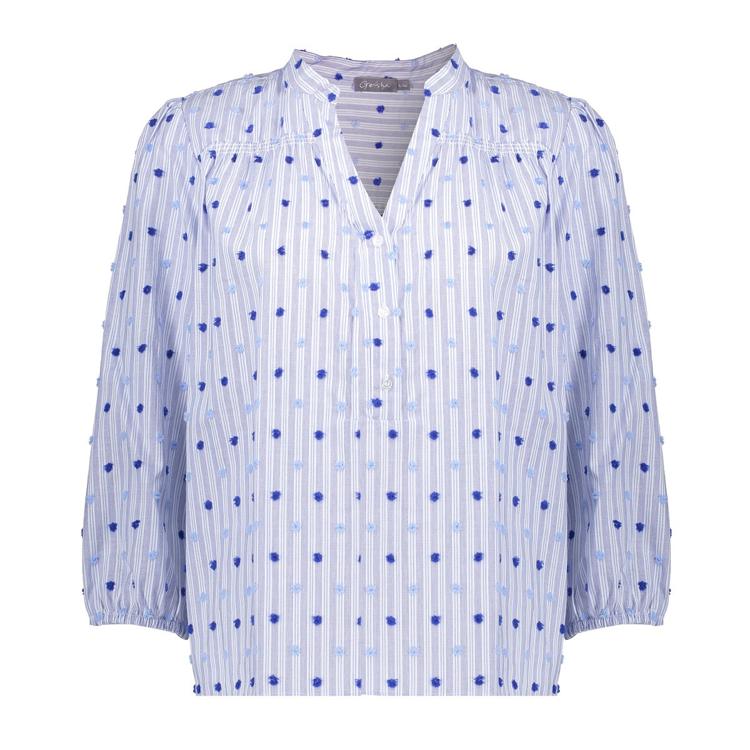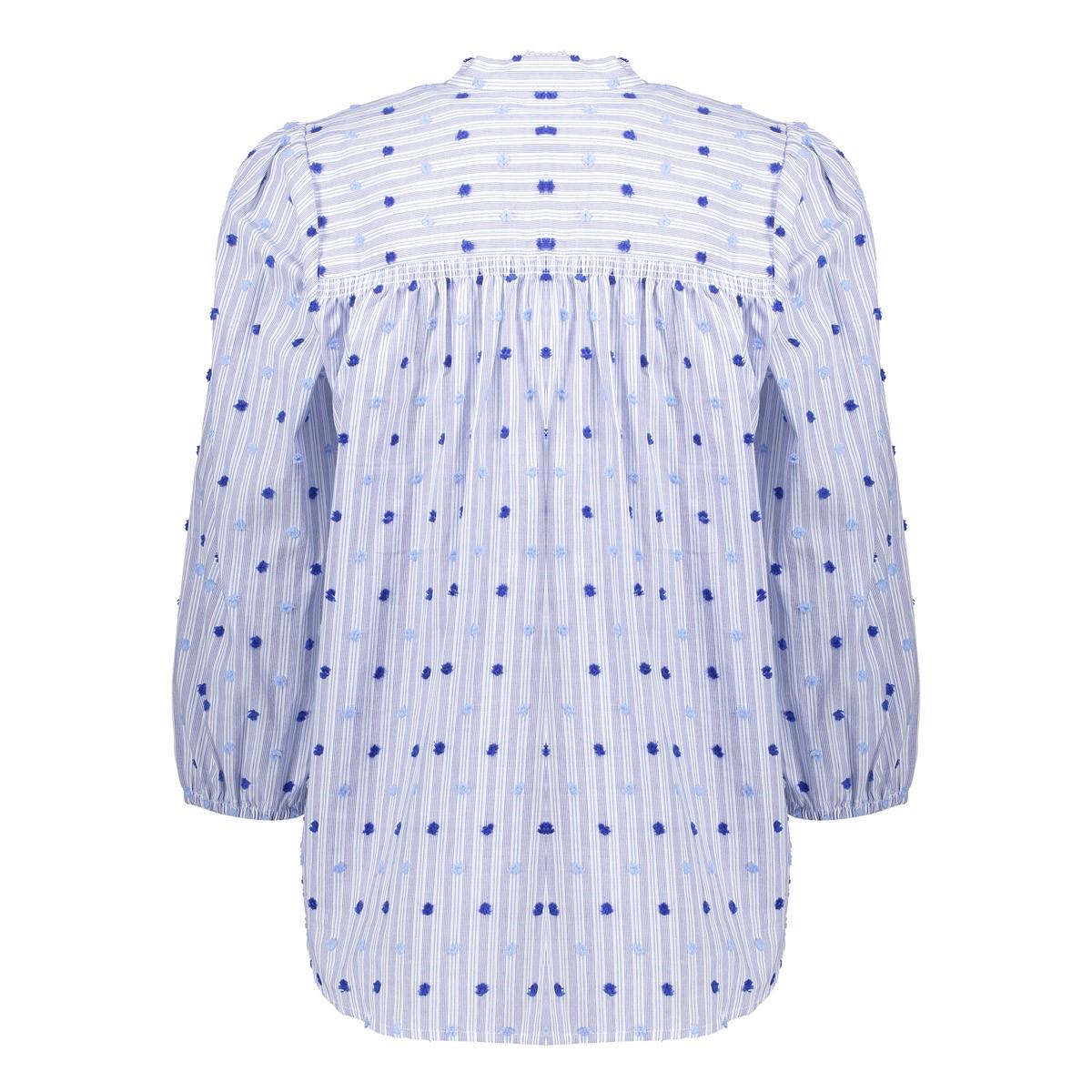 Deze damesblouse past in de trend van moderne romantiek: strepen & stippen, zachte volumes en frisse blauwtinten. Je combineert ‘m moeiteloos met een donkerblauwe jeans, een witte pantalon of onder een blazer voor werk. Draag met sneakers voor casual of met loafers voor chic. Favoriet dit seizoen-shop op tijd.