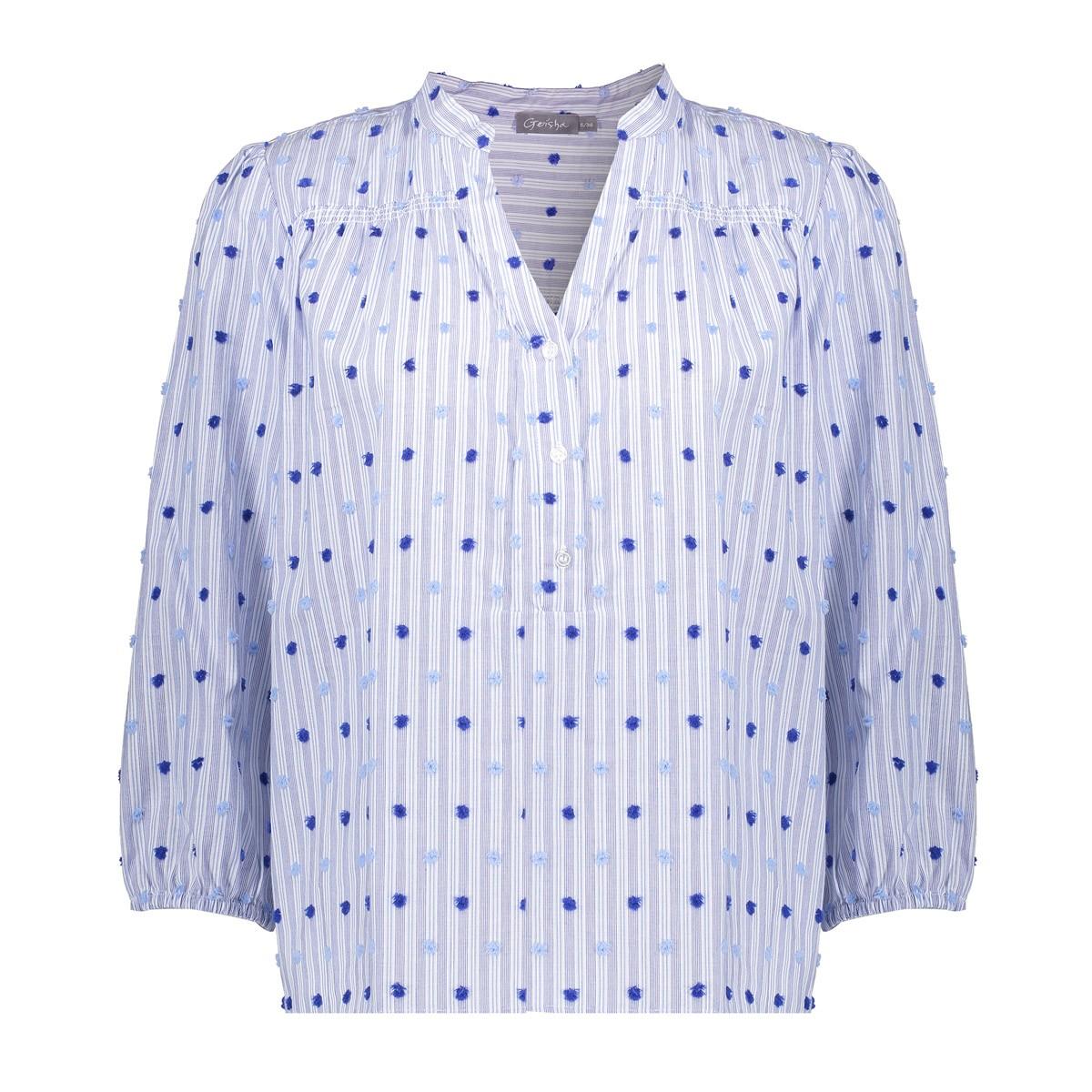 Geisha Blouse 63057-14 is een luchtige damesblouse van Geisha met een verfijnd streepdessin en kobaltblauwe stippen. De blouse heeft een V-hals met subtiel opstaand kraagje, zonder zichtbare knoopsluiting. Licht geplooide schouders en een rugpas met rimpeling geven extra beweging. De mouwen vallen driekwart en sluiten met elastische manchetten. De afgeronde zoom zorgt voor een mooie lengte over de heup. Soepele, geweven kwaliteit die comfortabel draagt en mooi valt. Categorie: Dames, Blousen & Tunieken.