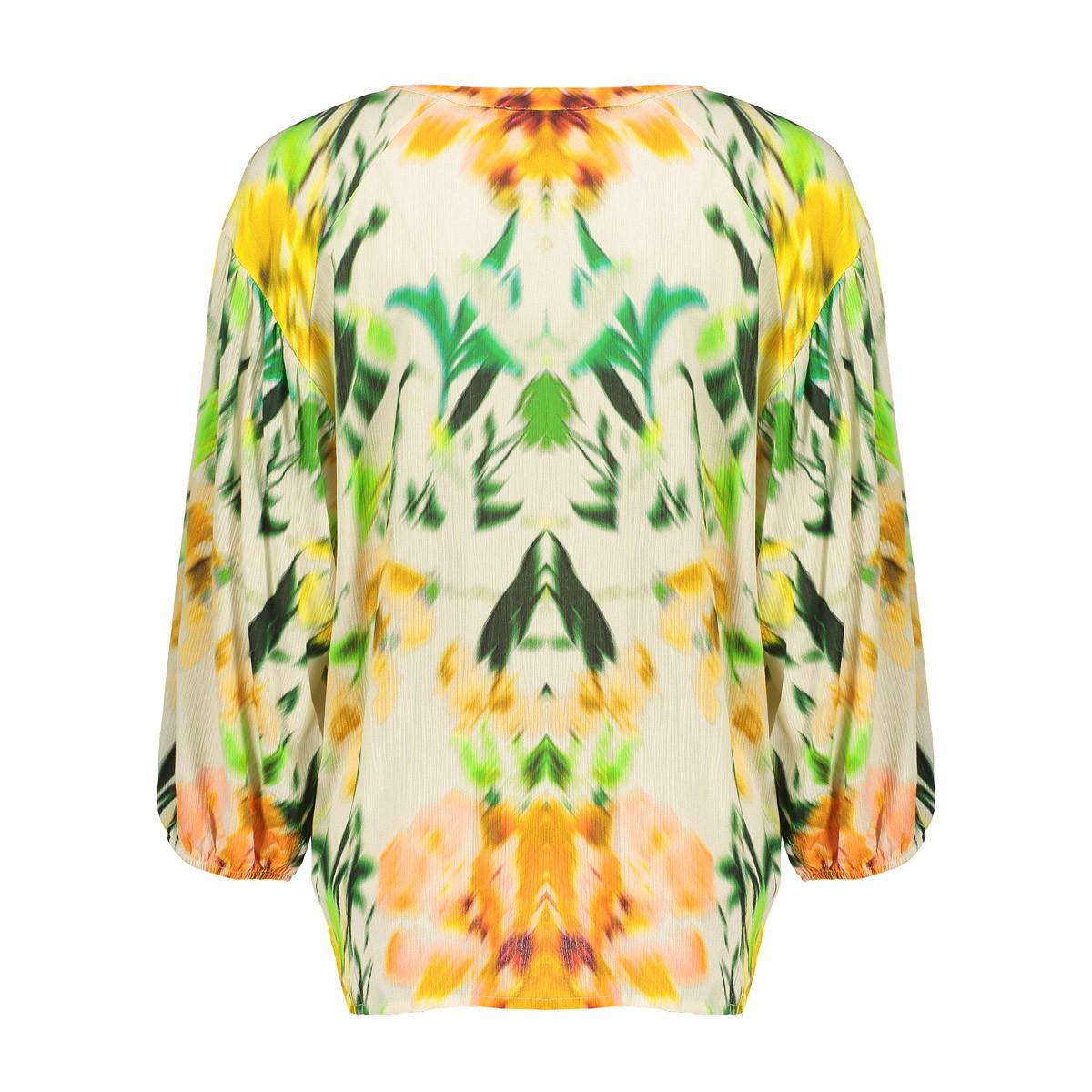De Geisha Blouse 63209-20 is uitgevoerd in een luchtige, licht transparante geweven kwaliteit. De blouse heeft een V-hals met smalle opstaande kraag en een halve knoopsluiting met fijne knoopjes. De ballonmouwen met elastische boorden zorgen voor een elegante vorm. Het aquarel bloemen dessin in geel, groen en oranje op een lichte basis valt op zonder te overheersen. Geen borstzakken of zichtbaar logo. Dames ontwerp, perfect binnen Blousen & Tunieken. Beschikbaar zolang de voorraad strekt.