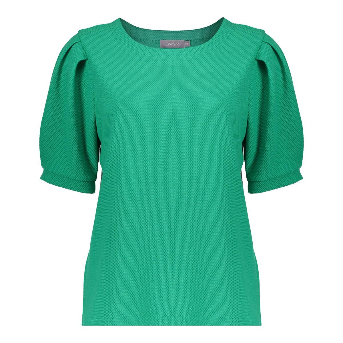 Geisha Top 62052-21 is een dames top van Geisha binnen de categorie Dames, T‑Shirts & Tops. Het kledingstuk is uitgevoerd in een effen groentint met subtiel gestructureerde stof. De ronde hals en korte pofmouwen met plooidetail en vaste manchetten geven volume, terwijl de rechte zoom voor een nette finish zorgt. Het model heeft een rechtvallende pasvorm, is ongevoerd en sluitingsloos, dus je trekt het eenvoudig aan. Zonder zakken of zichtbare logo’s; focus op clean design en comfort.