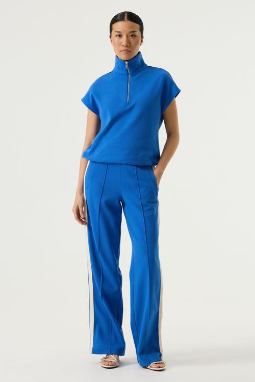Deze dames broek in helder kobaltblauw valt op door contrasterende zijstrepen in wit & blauw. Het pull-on ontwerp zonder zichtbare sluiting biedt gemak, terwijl de comfortabele tailleband nauw aansluit. Rechte pijpen met gestikte persvouw creëren een lang, slank silhouet. Steekzakken aan de zijkant geven praktisch voordeel. De soepele, elastische tricot met subtiele structuur voelt zacht aan en behoudt zijn vorm. Garcia levert verfijnde details & dagelijks draagcomfort in één kledingstuk.