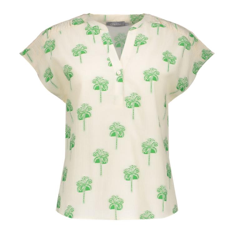 Geisha Top 63291-20 is een luchtige dames top van Geisha met soepele, zacht aanvoelende kwaliteit. De V-hals met subtiele split en aangeknipte korte mouw geven een moderne look. Het ecru kleurvlak is voorzien van een all-over palmboomdessin in fris groen. Pullover model zonder sluiting en zonder zakken, met rechte, licht losse pasvorm. Lichtgewicht en comfortabel, ideaal voor dagelijks dragen. Categorie: Dames, T-Shirts & Tops.