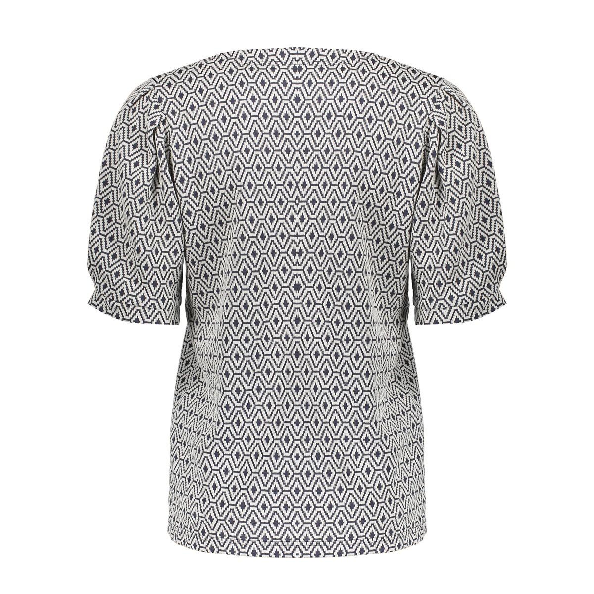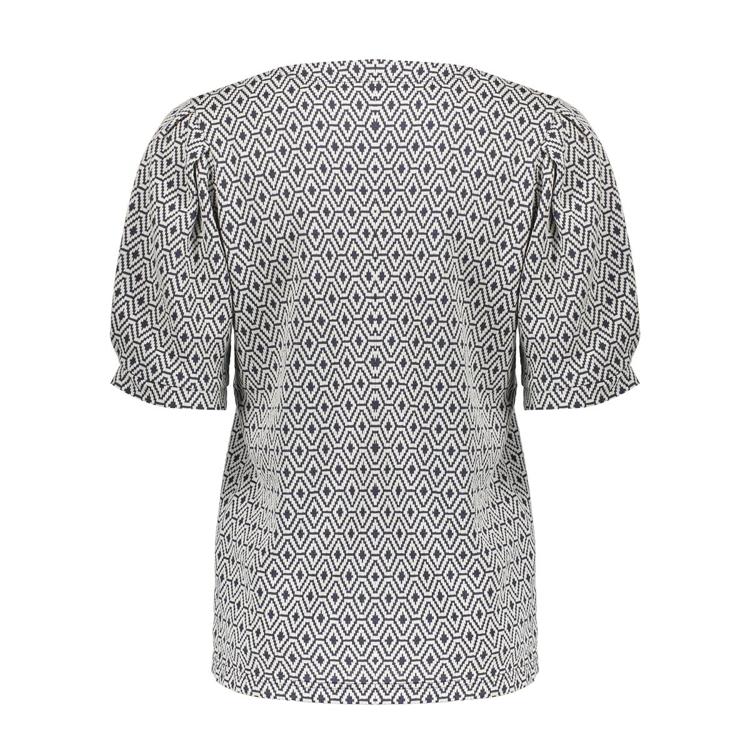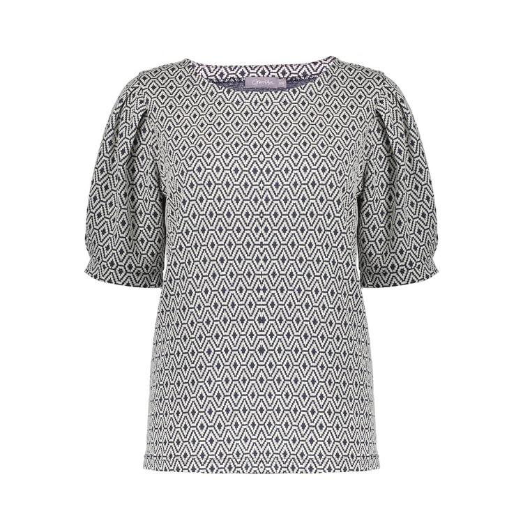 Dit kledingstuk is gemaakt van soepele tricot met een comfortabele stretch en valt recht. De ronde hals en de korte, licht gepofte mouwen met subtiele rimpel geven een vrouwelijke look. Je trekt de top makkelijk aan door het ontwerp zonder sluiting. Het all-over grafische dessin in zwart-wit met diamantvormen oogt fris en tijdloos. Afgewerkt met een rechte zoom voor een verzorgde finish. Merk: Geisha. Categorie: Dames, T-Shirts & Tops. Geslacht: Dames.