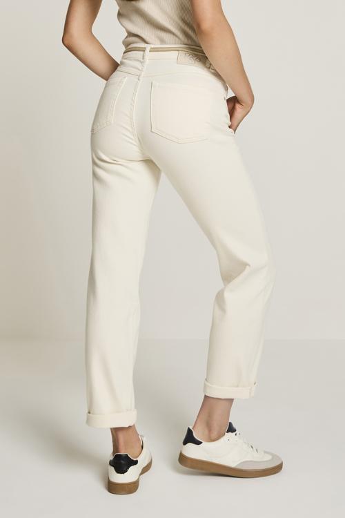 De zachte ecru kleur past in de soft-neutrals trend en oogt modern voor Dames. De rechte pijp met omslag en het taillekoord geven een casual-chic look. Je combineert deze spijkerbroek moeiteloos met een blazer en loafers voor kantoor, of met sneakers en een trui in het weekend. Neutrale tinten en minimalistische details versterken het hedendaagse ontwerp.