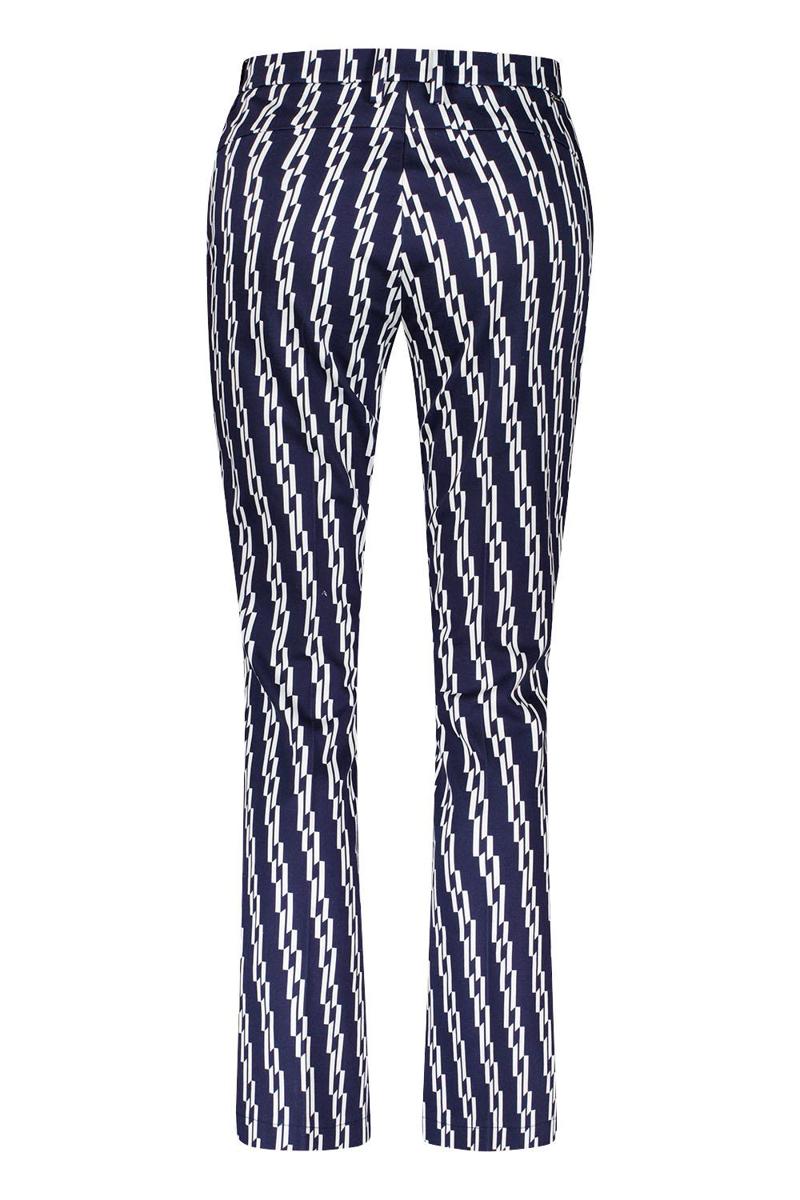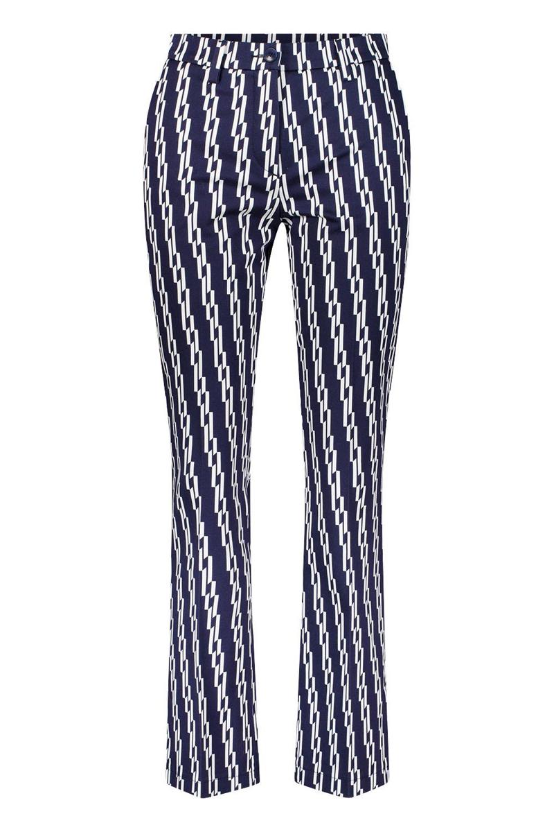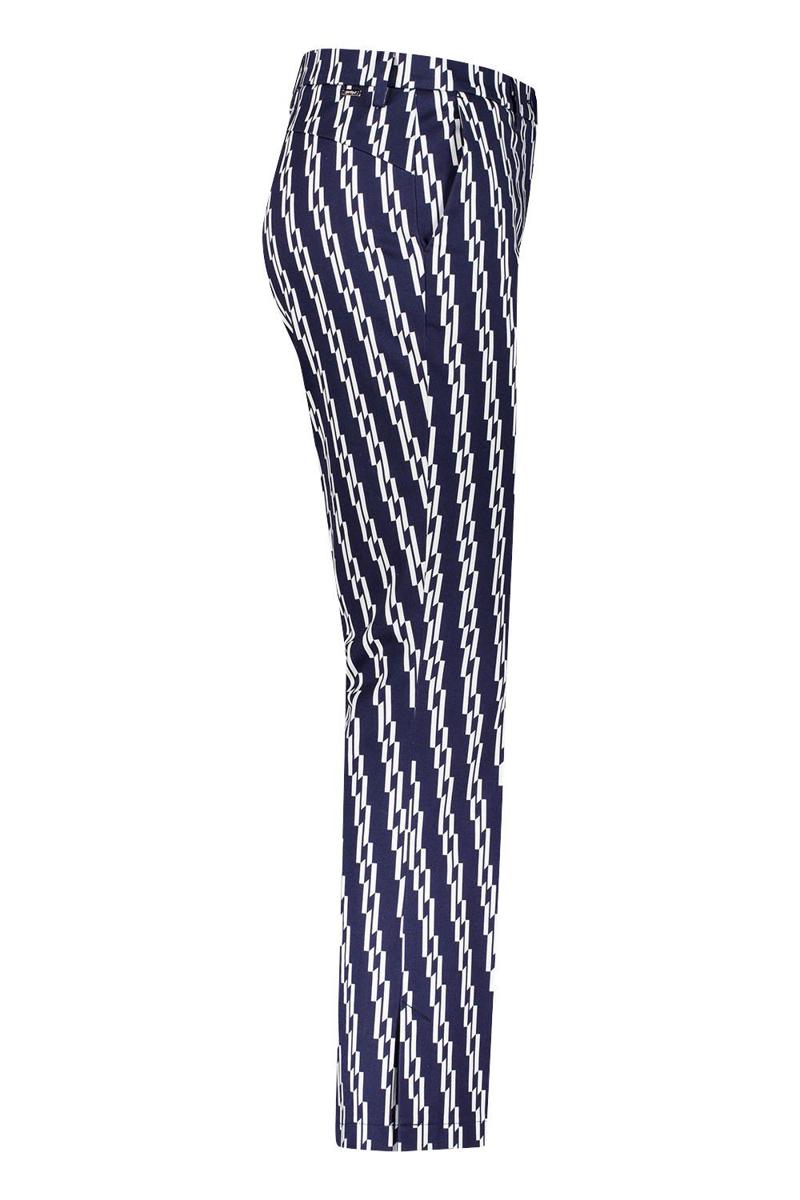Deze Gardeur broek voor dames heeft een rechte, volle lengte en een strak afgewerkt silhouet. De donkerblauwe pantalon valt op door het grafische dessin met diagonale strepen in wit. De tailleband is voorzien van riemlussen voor een verfijnde, aangeklede look. De pasvorm is doordacht en de kwaliteit voelt comfortabel aan, zodat je de hele dag prettig draagt. Een nette damesbroek die moeiteloos inzetbaar is, van kantoordag tot gelegenheid.