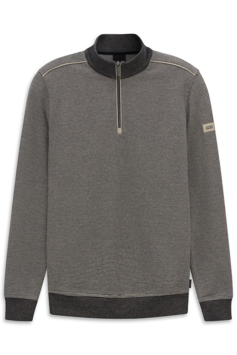 Deze heren sweater van Bugatti is uitgevoerd in een zachte, vormvaste gebreide kwaliteit met subtiele structuur. De opstaande kraag met halve rits biedt ventilatie en comfort. Contrasterende ribboorden aan kraag, mouwen en zoom zorgen voor een nette pasvorm. Fijne schouderstiksels geven extra detail. Op de linker mouw zit een badge met het woord ‘bugatti’. Het tijdloze ontwerp maakt dit kledingstuk onderhoudsvriendelijk en geschikt voor dagelijks gebruik.
