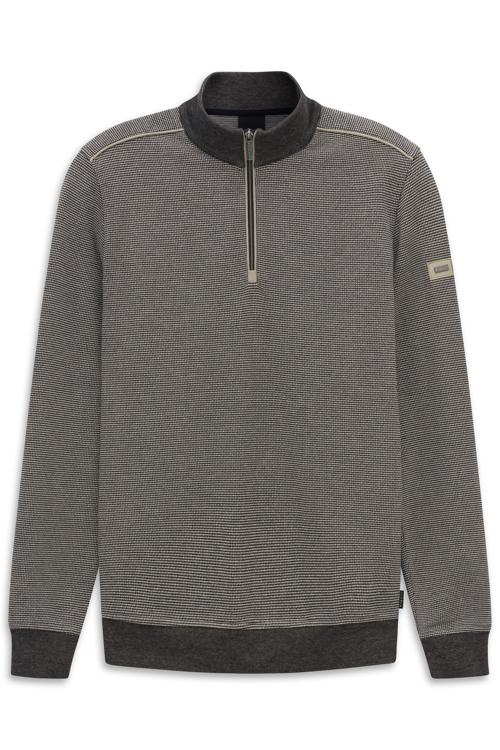 De kleur oogt donkergrijs met een verfijnd dessin; de contrasterende boorden geven een sportief accent. Speciaal voor heren ontworpen, combineer je deze sweater moeiteloos met een jeans of chino, of draag hem over een overhemd bij kantoorafspraken. De halve rits maakt laagjes eenvoudig en houdt je comfortabel tijdens werk en weekend.