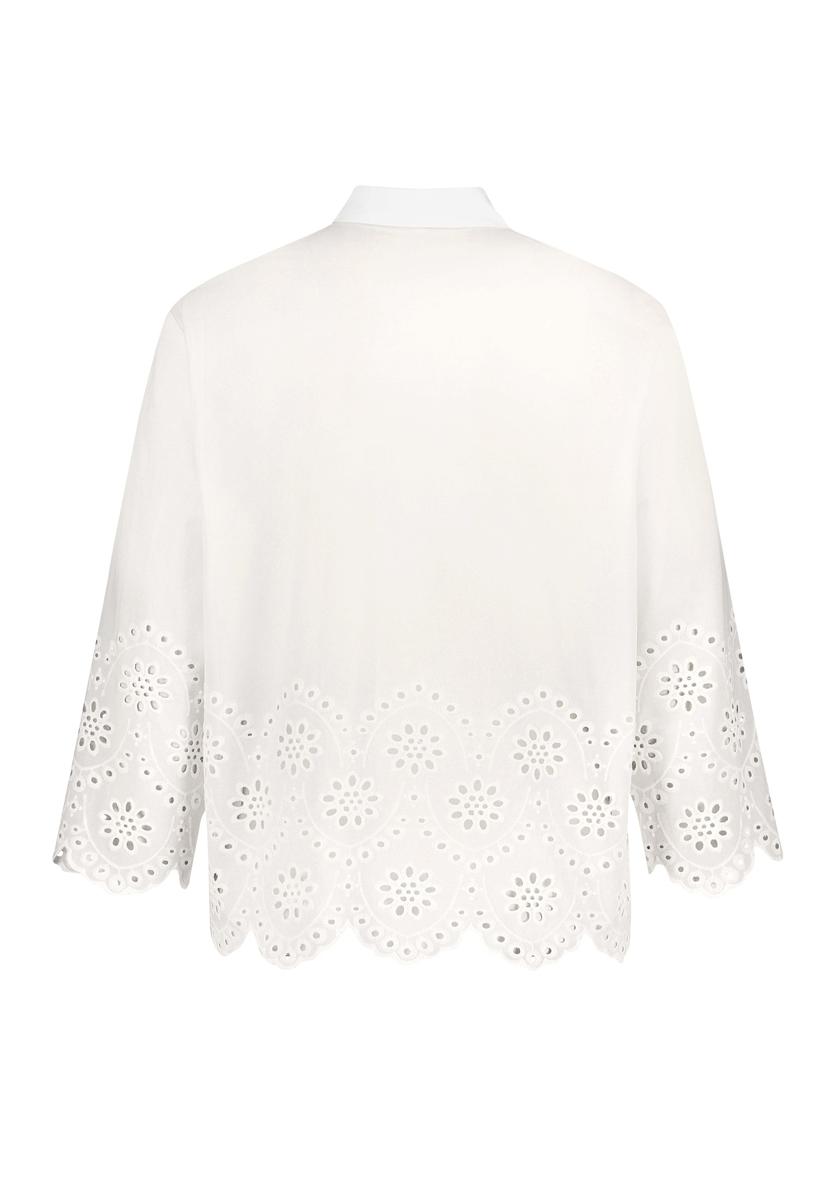 Deze blouse in fris wit is gemaakt van een lichte, soepele kwaliteit. Je ziet een klassieke kraag, een blinde knoopsluiting en 3/4 mouwen met een subtiel wijduitlopende vorm. De onderzoom en mouwboorden zijn versierd met broderie anglaise en een golvende, geschulpte rand voor een verfijnd effect. Het model valt recht en comfortabel, zonder zakken; het merk Betty Barclay staat stijlvol op het neklabel. Een tijdloze damesblouse die luchtig aanvoelt en netjes oogt.