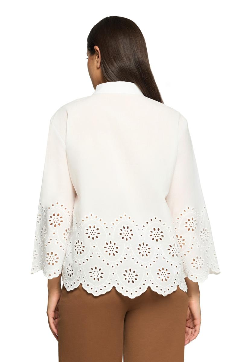 Dit kledingstuk past in de romantische broderie-trend en in de frisse wit-tinten van het seizoen. Je combineert het moeiteloos met een donkere jeans, een linnen broek of een nette rok; draag het overdag of naar een diner. Voor dames die houden van subtiele details geeft de geschulpte zoom extra charme. Voeg een neutrale tas & loafers toe voor een moderne, vrouwelijke look.