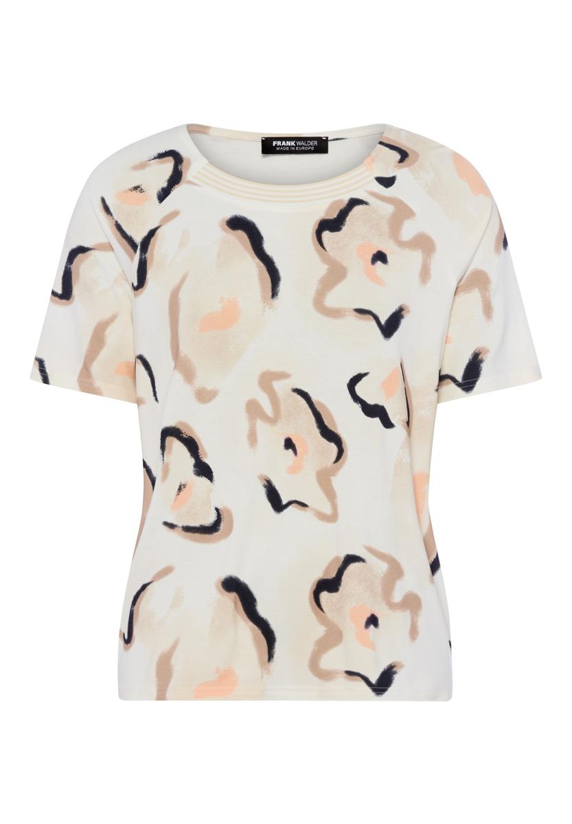 Dit T-Shirt is gemaakt in een zachte, soepelvallende kwaliteit. De ronde hals en korte mouw zorgen voor een verzorgde look. Je trekt het makkelijk aan dankzij het model zonder sluiting; zakken ontbreken voor een glad silhouet. Het dessin is all-over en toont een abstract bloemmotief met zand-, perzik- en donkerblauwe accenten op een lichte basis. De rechte pasvorm biedt comfort en blijft mooi in vorm, seizoen na seizoen.