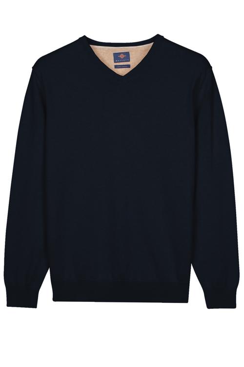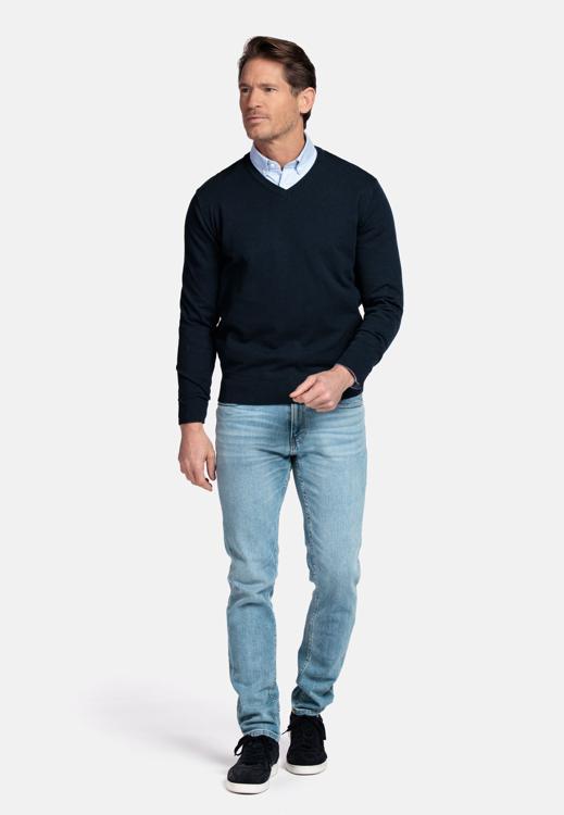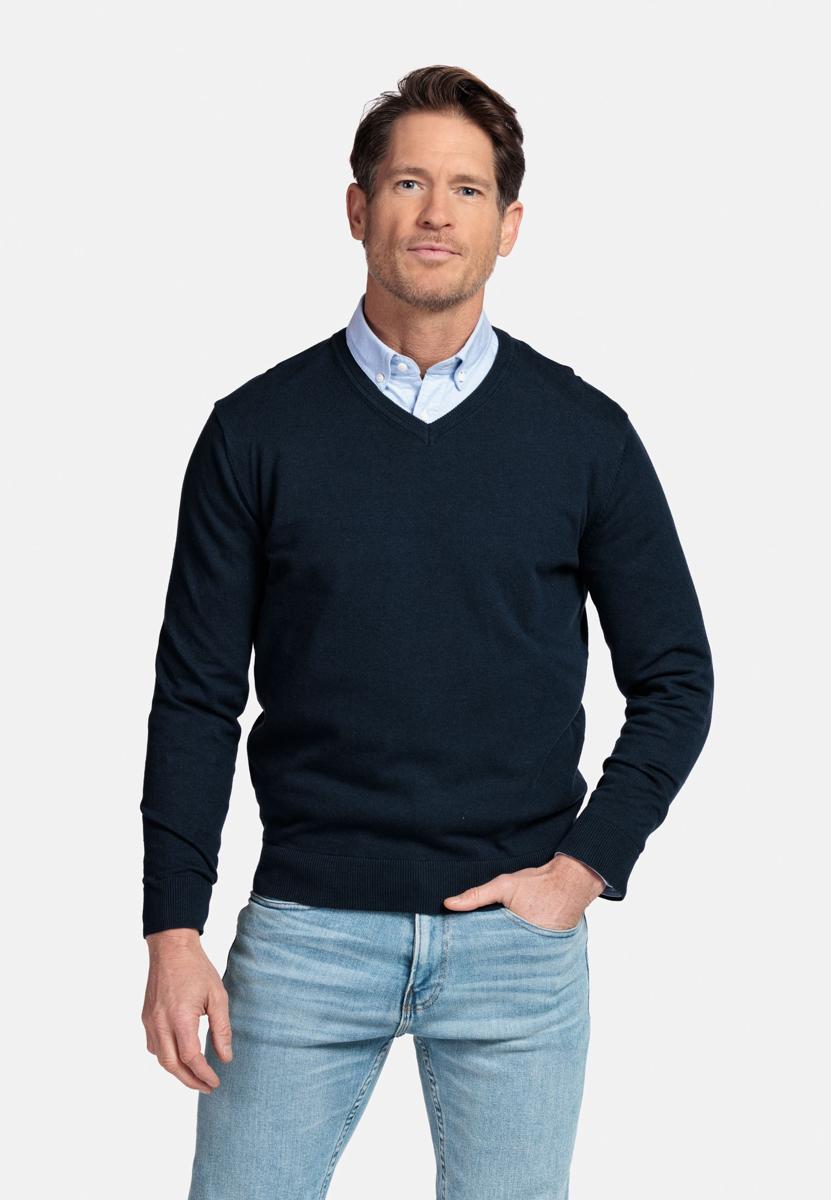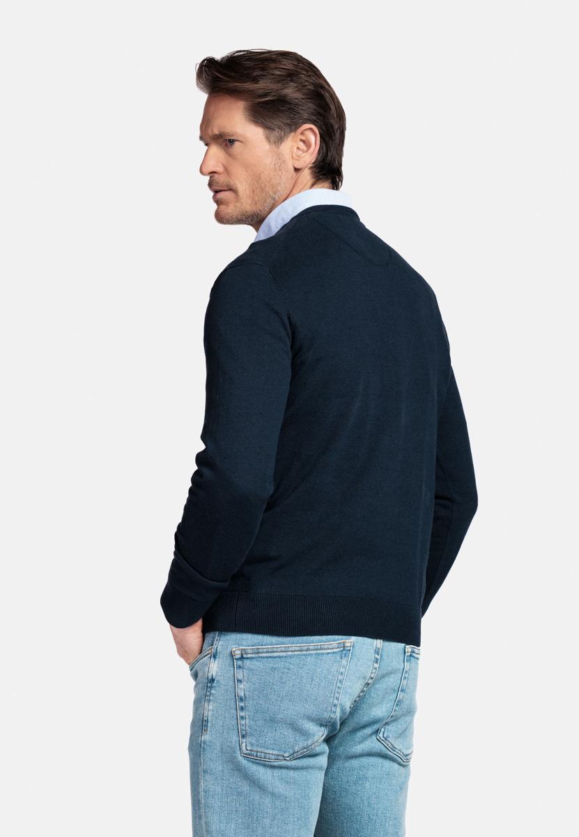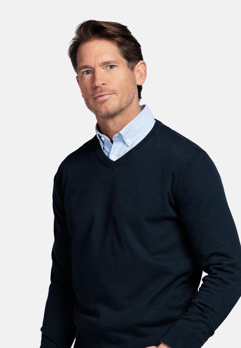 De effen donkerblauwe kleur oogt modern en maakt combineren eenvoudig. Voor heren die houden van verzorgd gemak: draag de trui solo, over een wit T-shirt of met een lichtblauw overhemd; met chino, jeans of onder een blazer. Perfect voor kantoor, diner of weekend. Zo bouw je stap voor stap aan een consistente, stijlvolle garderobe.