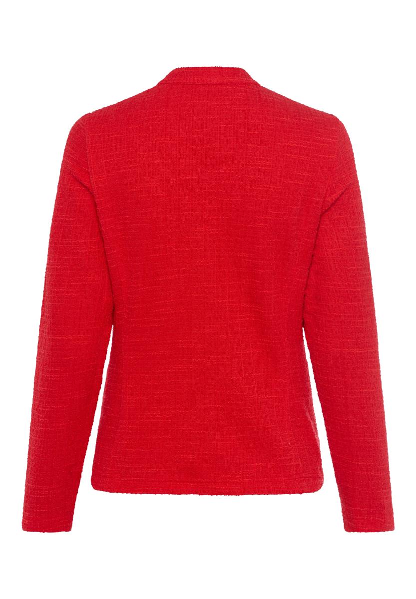 Deze dames blazer van Frank Walder valt op door de helderrode kleur en een verfijnde structuur. De ronde hals zonder kraag geeft een rustige look, terwijl de doorlopende ritssluiting voor een moderne afwerking zorgt. Het model heeft lange mouwen, een rechte zoom en een gladde, nette voorkant zonder zichtbare zakken. De kwaliteit voelt comfortabel aan en houdt mooi vorm, ideaal voor dagelijks gebruik en nette gelegenheden. Een veelzijdig kledingstuk uit de categorie Dames, Jassen en Jacks.