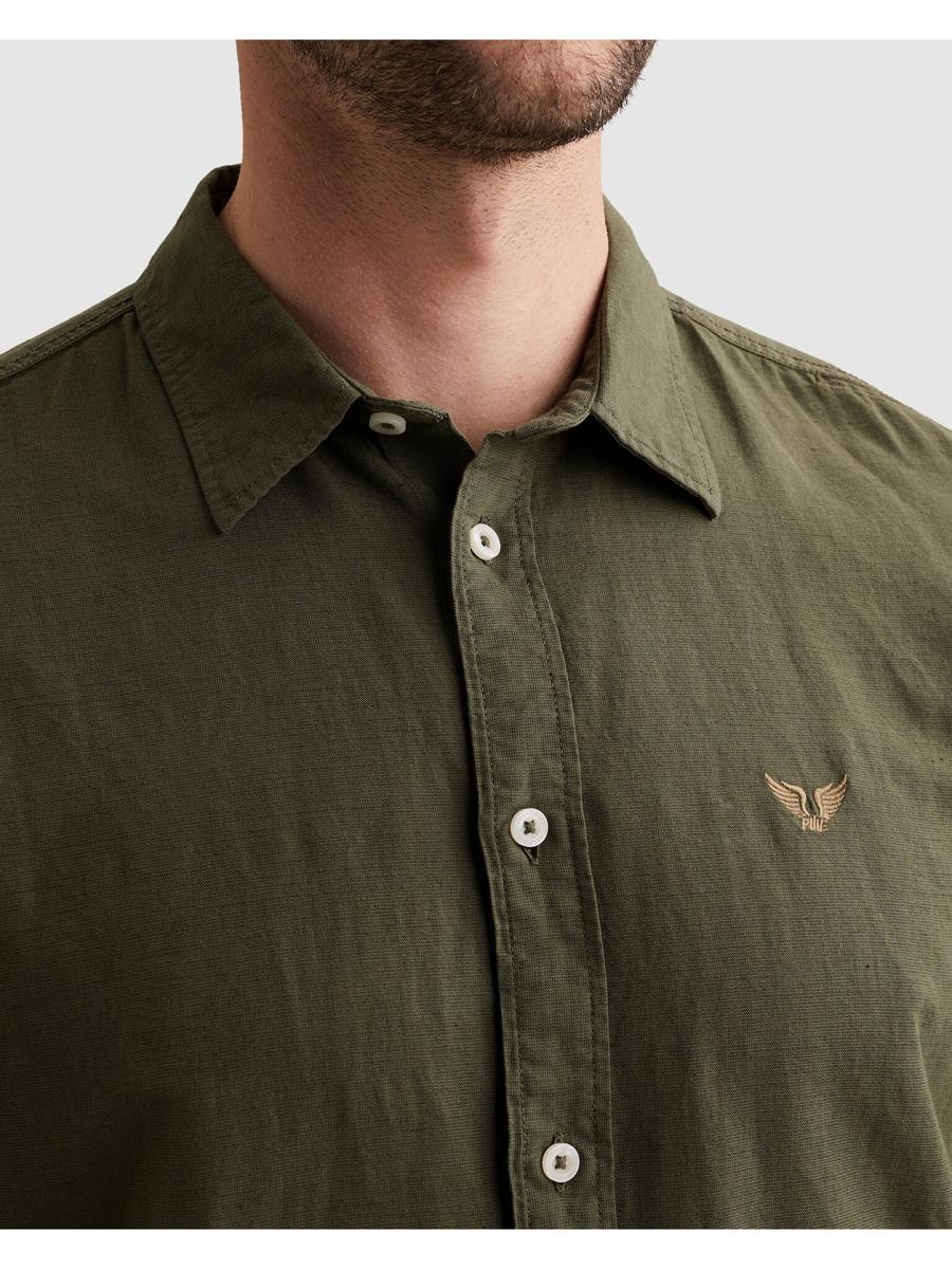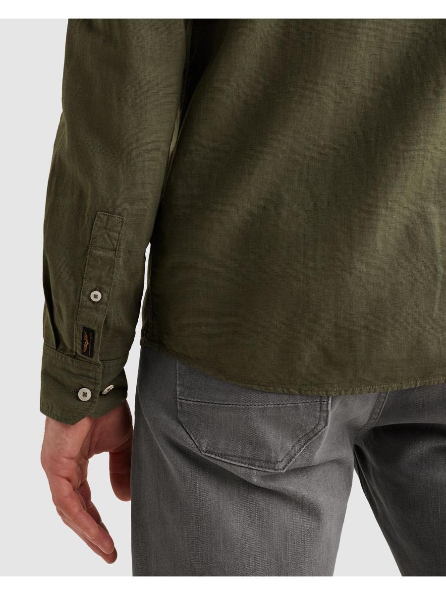 De olijfgroene, effen kleur geeft het heren overhemd een stoere en veelzijdige uitstraling. Combineer met een donkere jeans of een chino; onder een vest of jas blijft de kraag fraai liggen. Ideaal voor kantoor, etentjes en weekend, met een stijl die moeiteloos smart casual oogt en de PME Legend signatuur zichtbaar houdt.